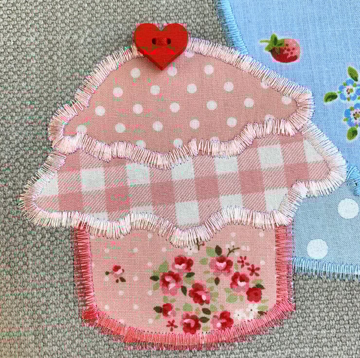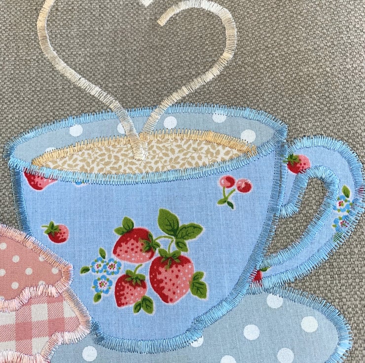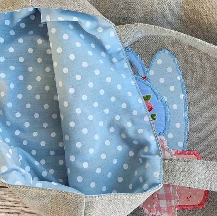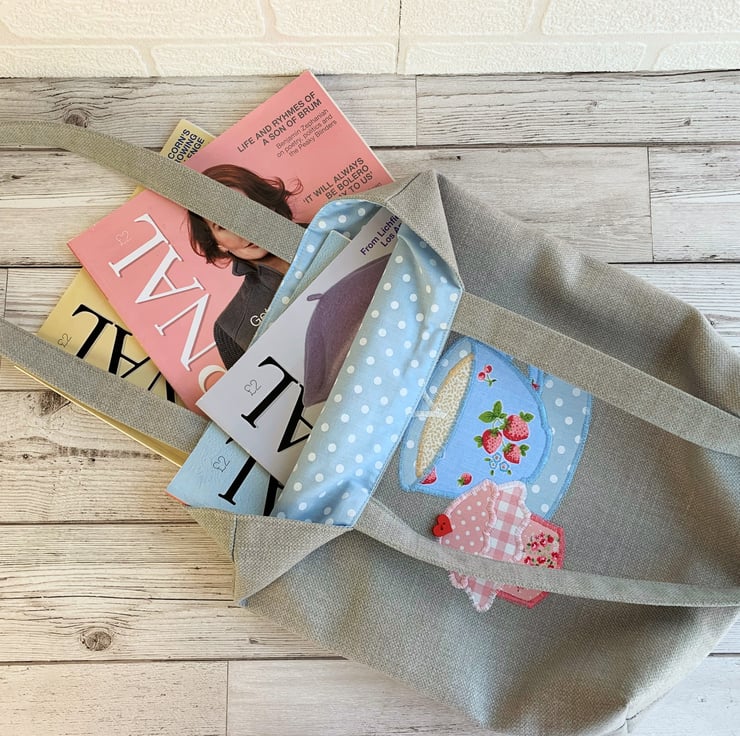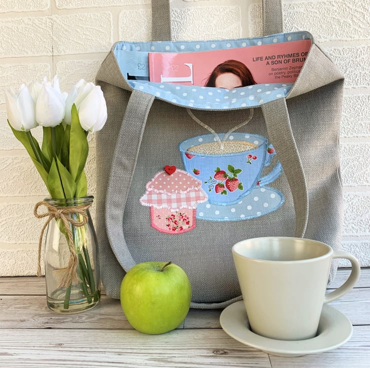 A pretty tote bag in pale grey fabric with a delightful appliqué scene depicting a cup and saucer with steaming tea or coffee and a cupcake. The cup is made from a lovely strawberry print fabric in shades of salmon pink, green and blue on a pale blue background. The saucer and the inside of the cup are pale blue with white polka dots. The double-layered cupcake and cake case are made from three co-ordinating pale pink fabrics with white polka dots, white checks and salmon pink flowers. I've embellished the cupcake with a red wooden heart-shaped button as a cherry on top. The tea or coffee is made from beige and cream fabric with a tiny ditsy leaf pattern. I've added machine embroidered satin stitch in off-white thread to depict steam curling upwards into a heart shape. The bag is fully lined with pale blue fabric with white polka dots to match the saucer.
