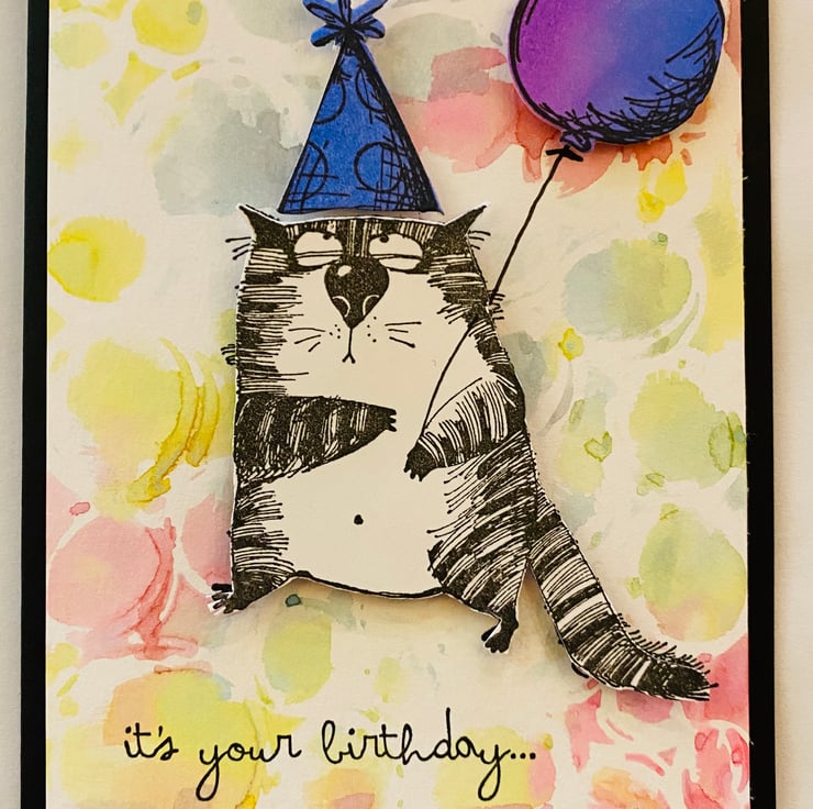 2) The background was created using a circles stencil with the same watercolours. The cat was stamped directly onto the card, and another one mounted on top to provide dimension.
