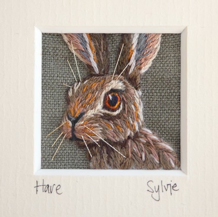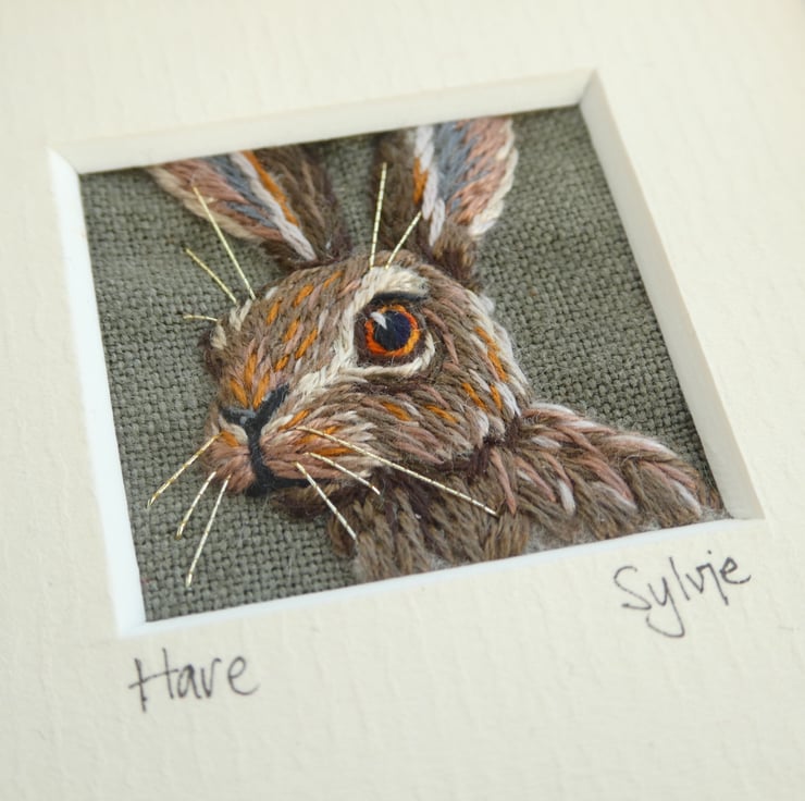 This little Hare was stitched with strands of embroidery thread - the image was built up using stitches of various lengths and colours, creating detail and depth. There's a glint of gold thread for his whiskers and there's a mischievous glint in his eye too!