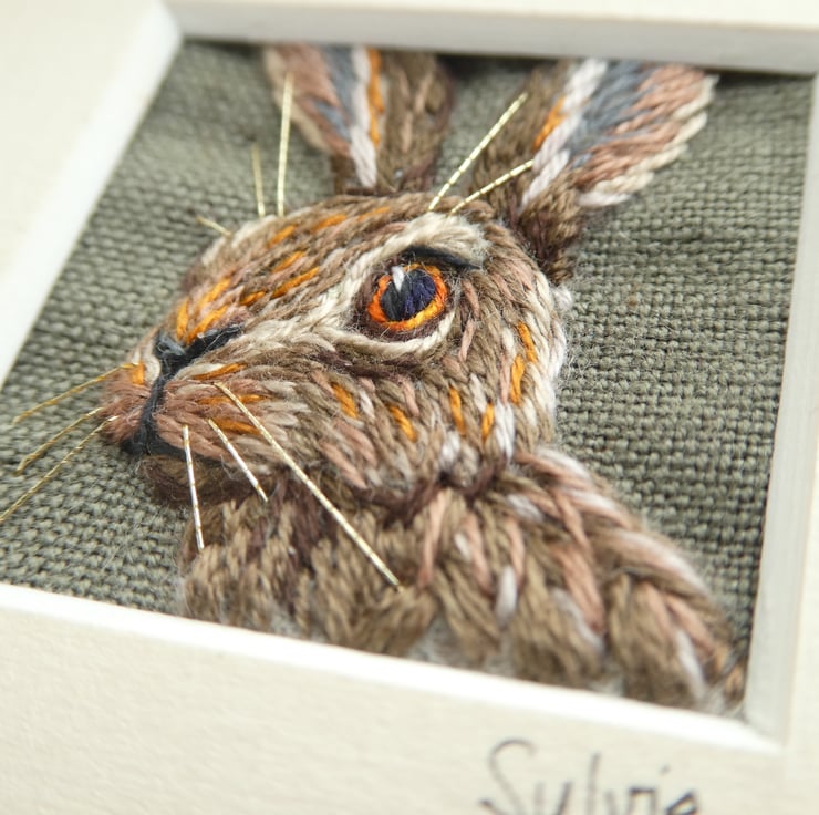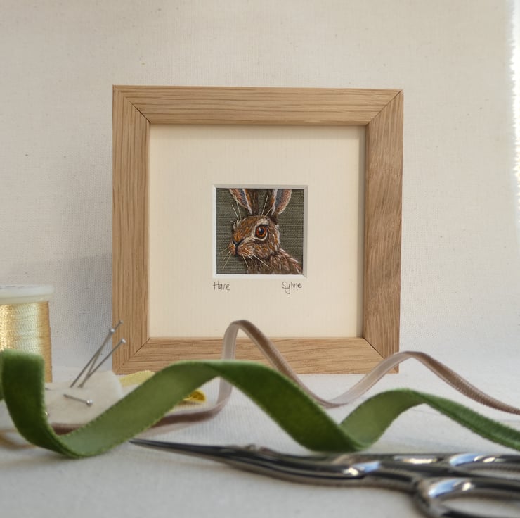 I photographed the Hare in natural light and without the glass for clarity, then it's protected behind glass in an oak frame. The embroidered piece is just over 3x3cms and the frame is about 10.5x10.5cms, and it's ready to hang.
