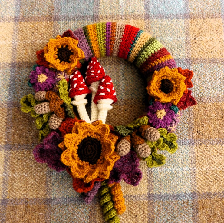 This beautiful crochet wreath made with dedication and care would be a lovely seasonal addition to any home. The 25cm (approximately 10inches) polystyrene wreath base is covered with a striped crocheted cover and the design is created using an abundance of different leaves, sunflowers, flowers, oak leaves and acorns, and a cluster of toadstools in the centre, in warm autumn hues. The wreath is finished off with some swaying curls. All elements are crochet by me and then hand stitched on to the base. Item made in a pet and smoke free home. Designed as a decoration not a toy.