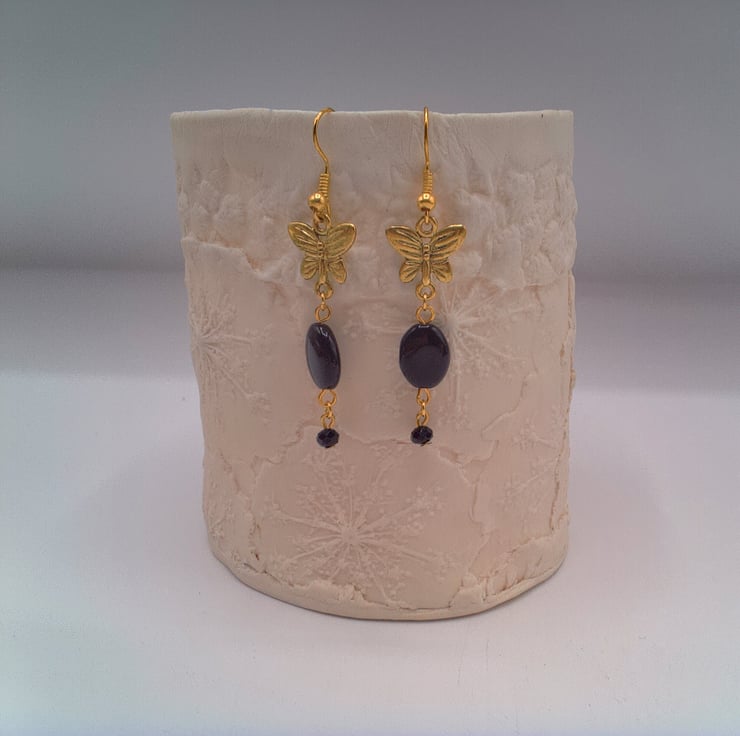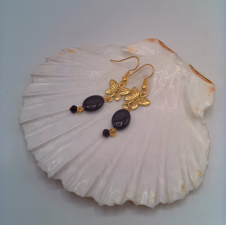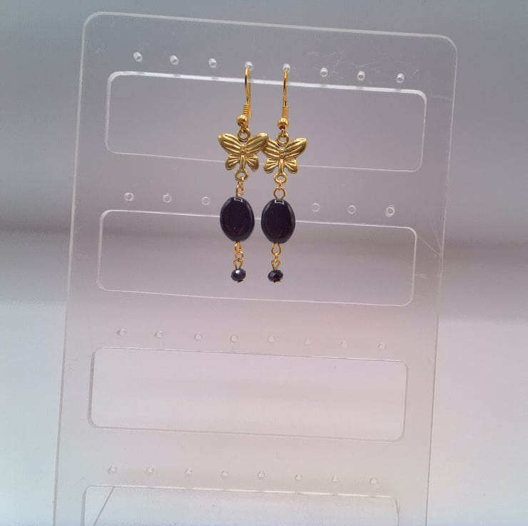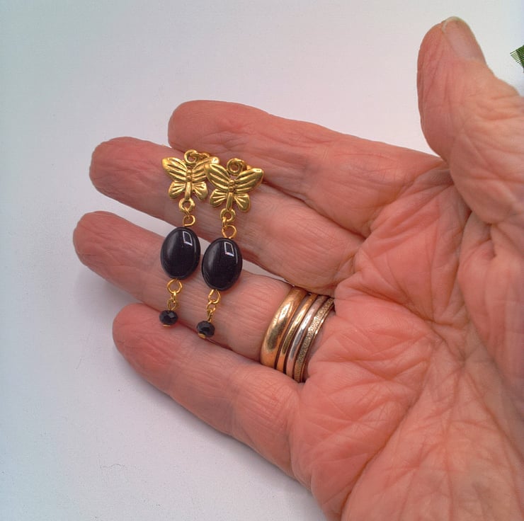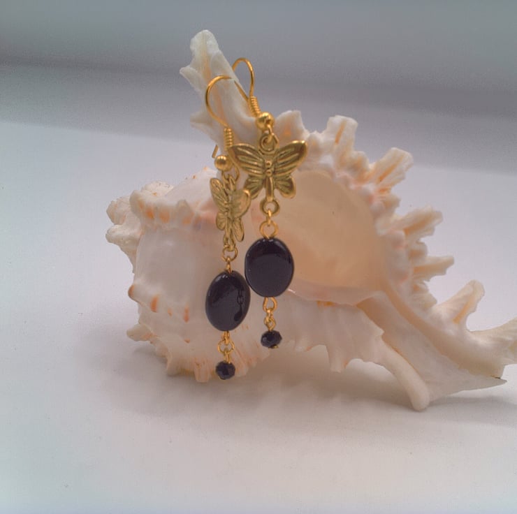 These pretty earrings would go well with any outfit you wear everyday or for a casual evening out. They would make the perfect gift for a friend or relative for a birthday or anniversary, or a lovely treat for yourself. The earrings are made using 12 mm x 10 mm oval black beads with a gold plated butterfly charm and a small 4 mm black faceted bicone bead. They are suspended on gold plated ear wires and they have a drop of 4 cm. The earrings will be dispatched wrapped in tissue paper in an organza bag and delivered to you via Royal Mail first class post.