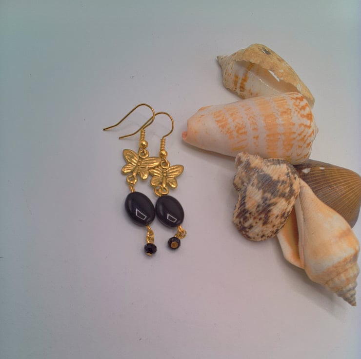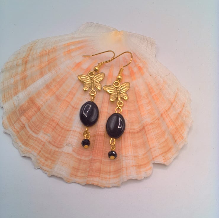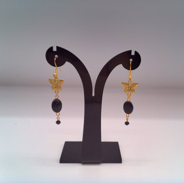 These pretty earrings would go well with any outfit you wear everyday or for a casual evening out. They would make the perfect gift for a friend or relative for a birthday or anniversary, or a lovely treat for yourself. The earrings are made using 12 mm x 10 mm oval black beads with a gold plated butterfly charm and a small 4 mm black faceted bicone bead. They are suspended on gold plated ear wires and they have a drop of 4 cm. The earrings will be dispatched wrapped in tissue paper in an organza bag and delivered to you via Royal Mail first class post.