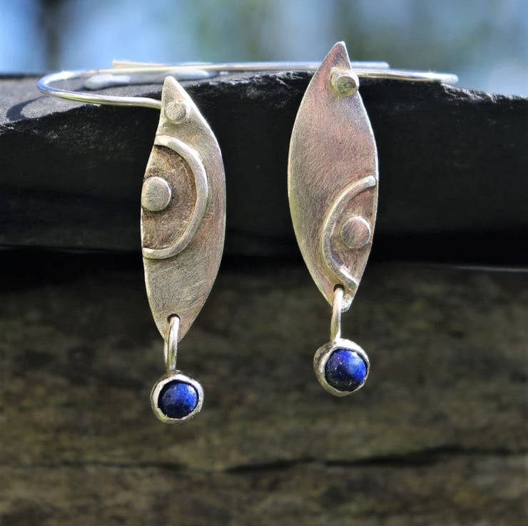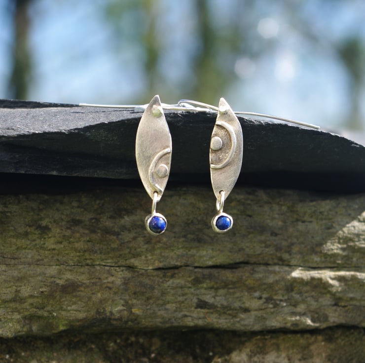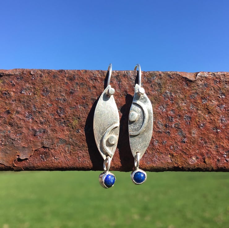 Lapis lazuli cabochon stones dangle from silver leaf shapes. The blue stones have been set in a sterling silver surround and dangle freely . The jump ring attaching them to the silver leaf shape has been soldered shut to prevent it coming adrift.