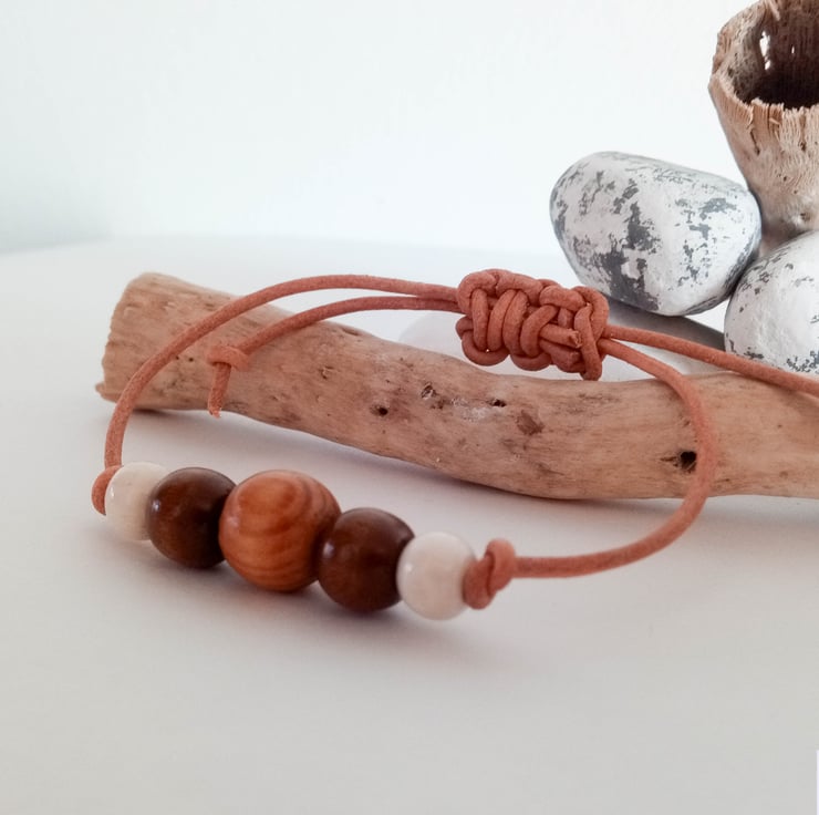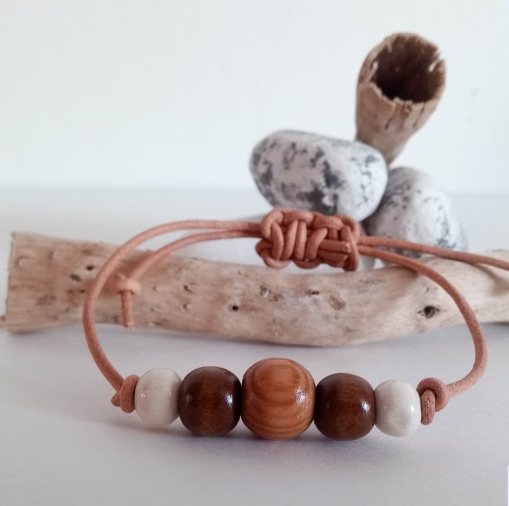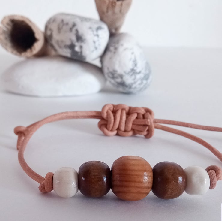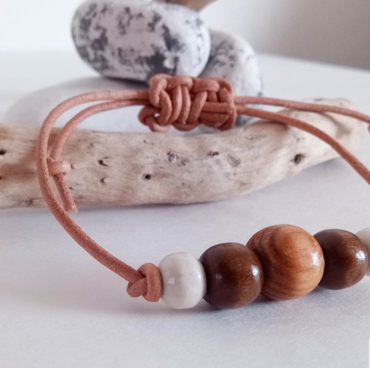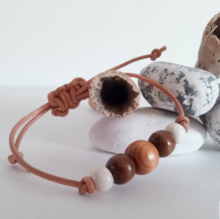 This leather cord bracelet has 4 wooden beads as the main feature. The bracelet uses macrame knots to allow it to be adjustable.