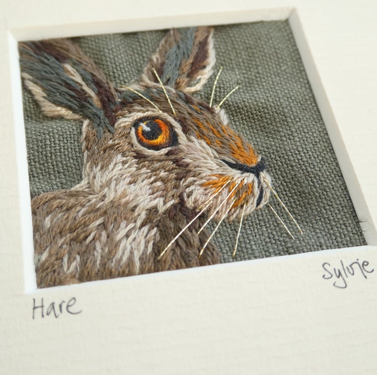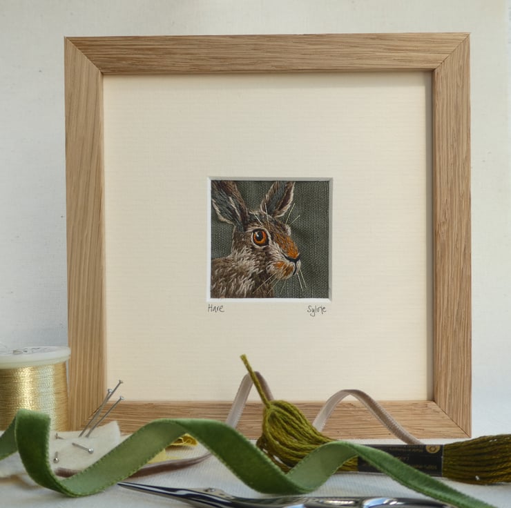 I've photographed the picture in natural light without the glass for clarity, then it is protected in an oak frame with the glass in place. The stitched piece is just over 4x4cms and the frame measures 14.5x14.5cms, and is ready to hang or display.