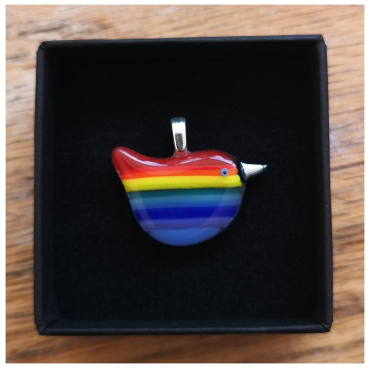 This little bird was a labour of love as I make the rainbow glass and then grind each bird into shape by hand, using cold working tools and machinery, before a second and sometime third firing. I am mostly taking away glass to grind and carve into shape.