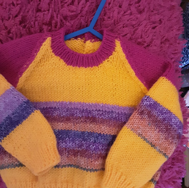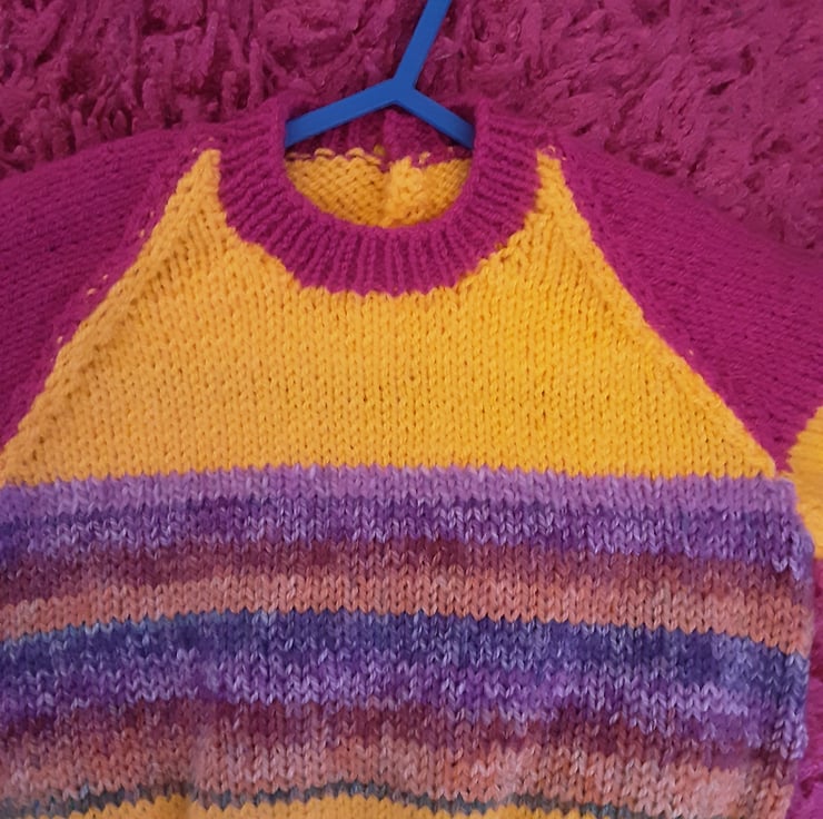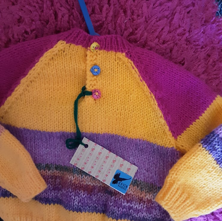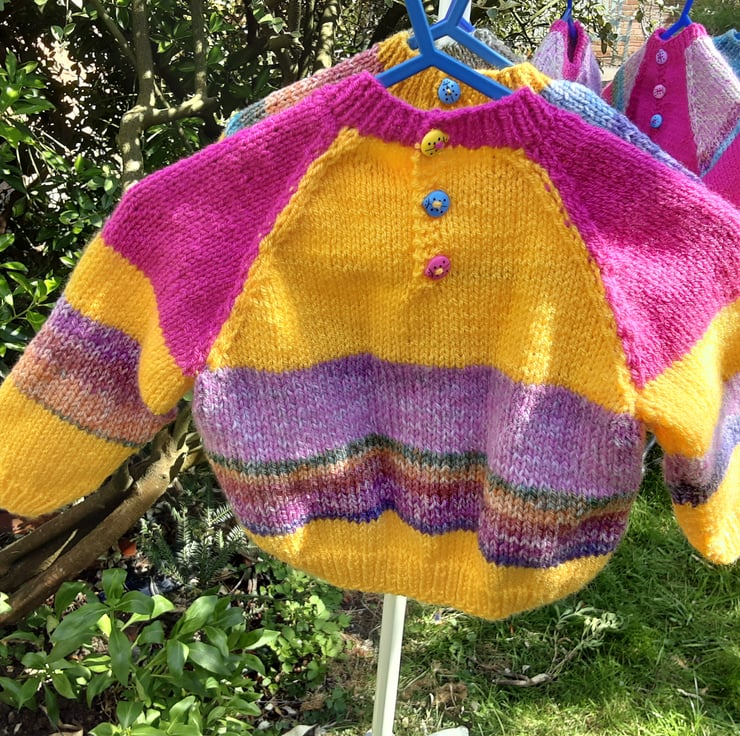 So sunny and gorgeous with bright in-your-face colours of sunflower yellow and peony pink and blended with stripes of subtle heathers, greens and marigold, this hand knitted jumper will brighten even the gloomiest of days! Made to fit 20 inch chests back length 11 inches and sleeve length 7 inches, approximately 9 to 12 months, but please do check baby's measurements as all little ones are unique. Three colourful ladybird buttons at the back make dressing a breeze.