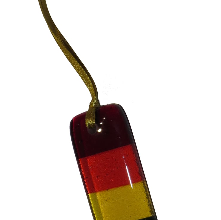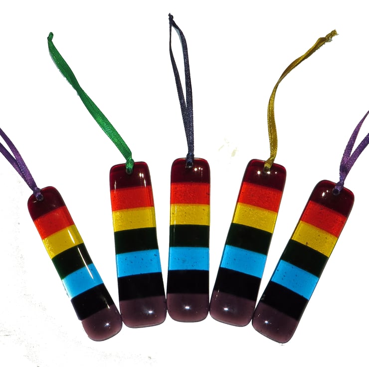 They are approximately 9 cm long and just over 2 cm wide and hang from a colourful ribbon.