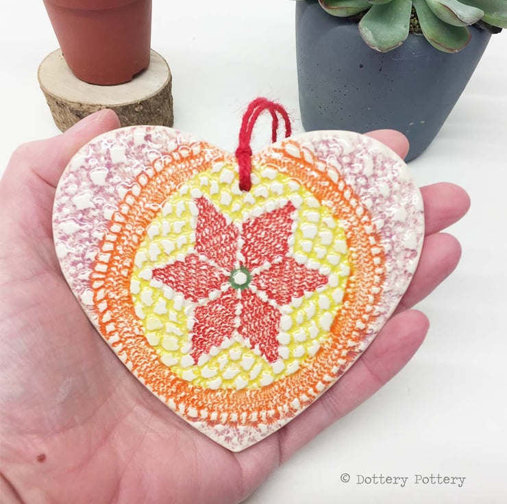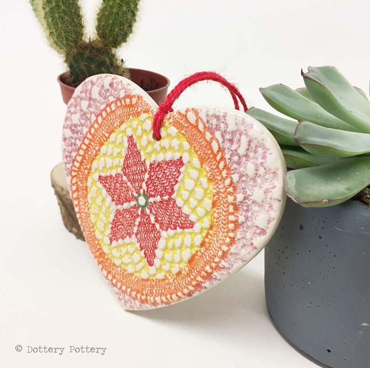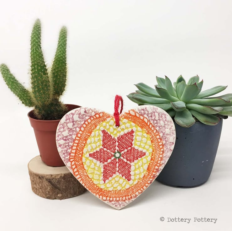 This ceramic heart is made from white earthenware clay, imprinted with pattern and colour and finished with a clear, glossy glaze. It has been fired twice, once to the bisque stage and then a second firing for the glaze. It measures 10 centimetres wide and the same in height x 5mm thick. It has a tie dye effect pattern and would be great for a festival lover. It can be hung outside.