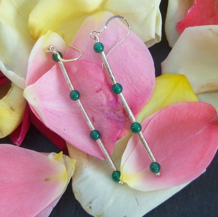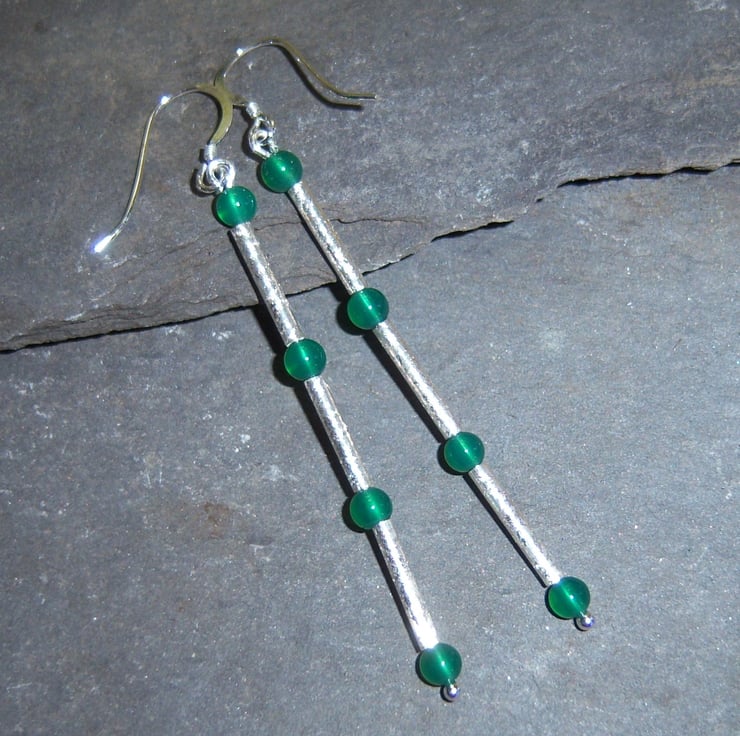 Long dangly earrings made up of textured sterling silver tube over wire with interspersed green agate stones.