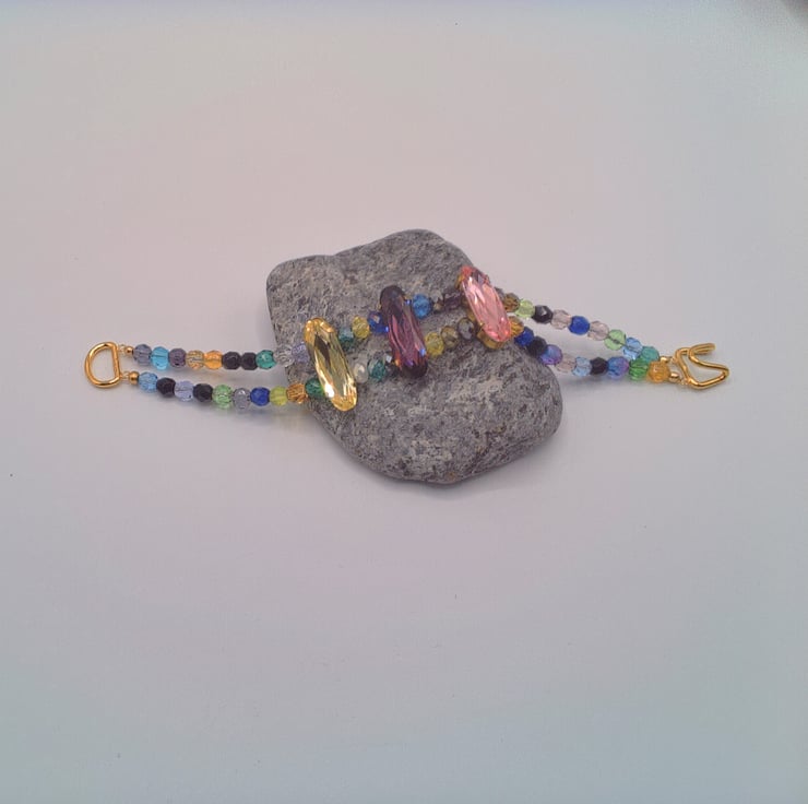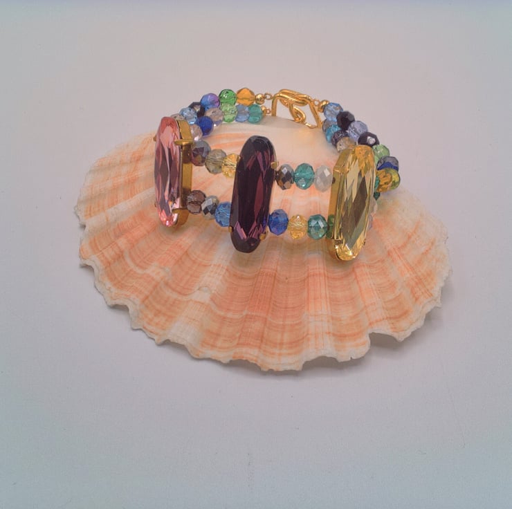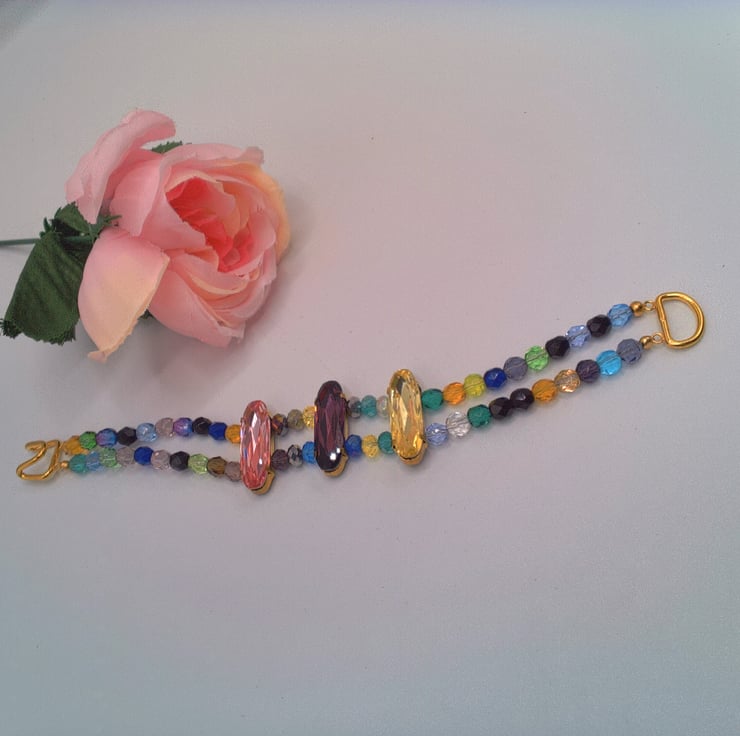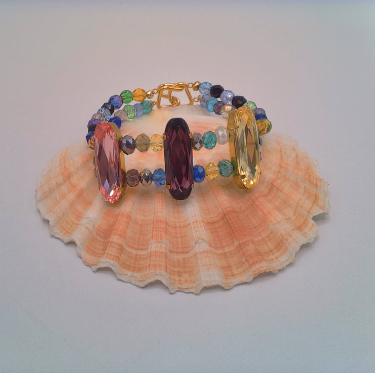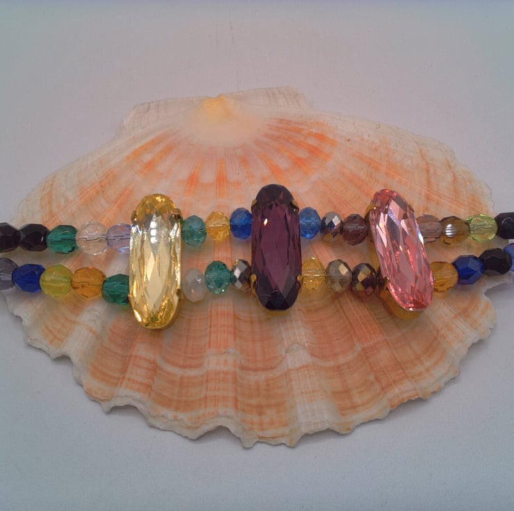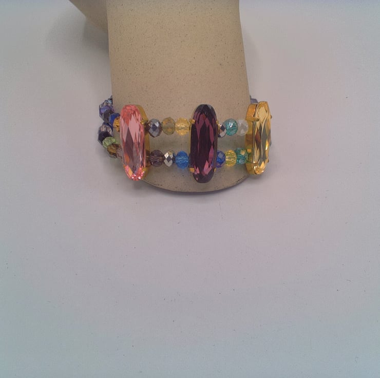 This stunning Crystal baguette and Glass Crystal bracelet would match well with any outfit you wear for a special occasion or for a party. It would make a lovely gift for a special lady for a birthday or anniversary or a lovely treat for yourself. The sparkly bracelet is made using multi coloured 6 mm glass crystal beads and rondelles with 3 sumptuous baguette elements crystals at it's centre. The Elements are lemon, purple and pink. The bracelet is fastened with a gold plated clasp. It measures 7.5 inches (19 cm) and will comfortably fit a wrist that is 18 - 19 cm in circumference. The bracelet will be dispatched wrapped in tissue paper in an organza bag and delivered to you via Royal Mail first class post.