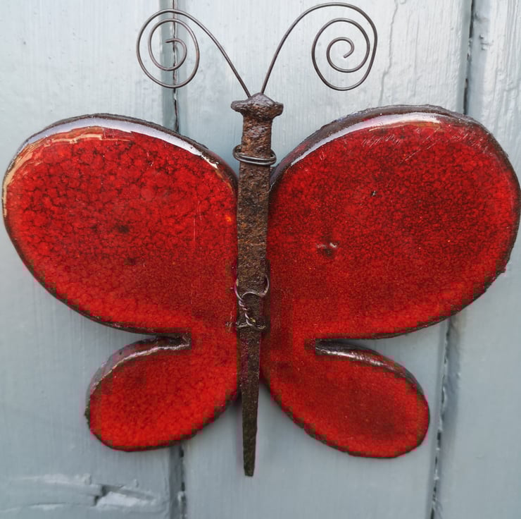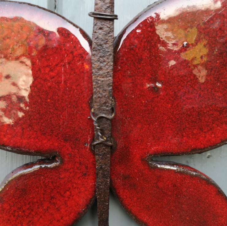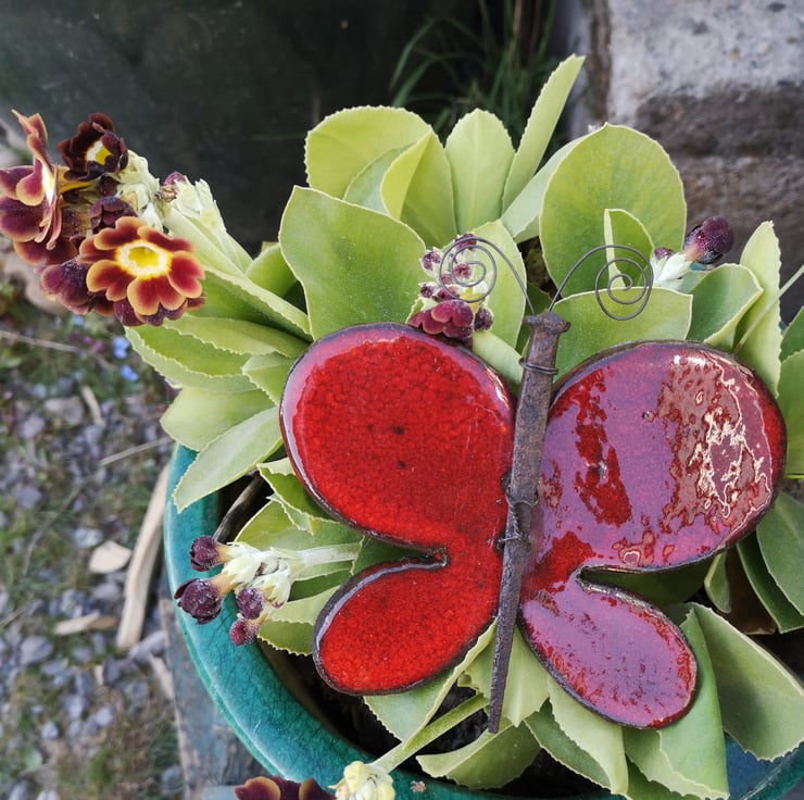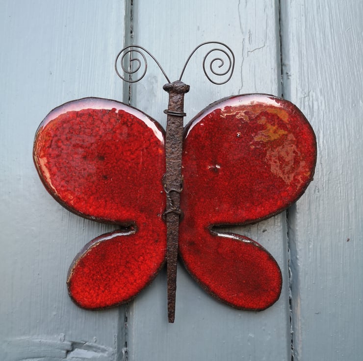 Hand crafted individually my Pottery Butterflies can be used to decorate indoors or outside. As with all of my pottery beasties, each one is individual, I handcut the clay before drying, firing then apply glazes that often give striking colours ! Each Butterfly is finished off with a rusted, upcycled Horseshoe nail. There is an easy-to hang hook on the back.