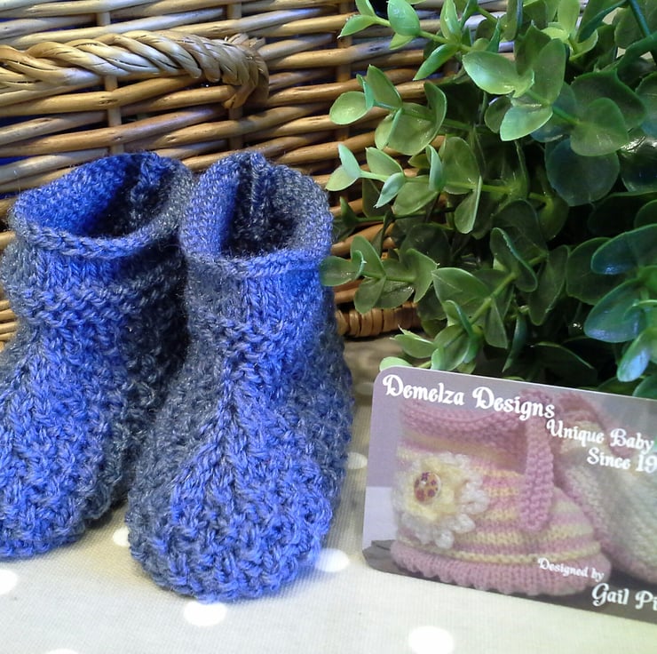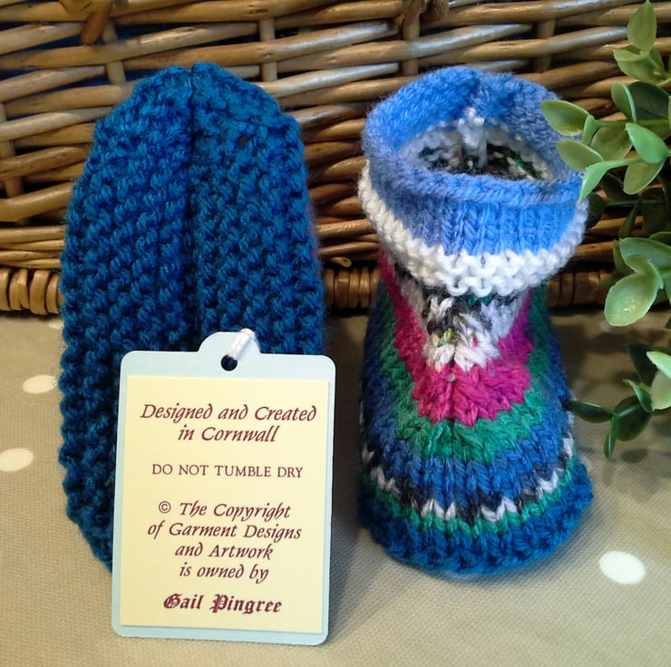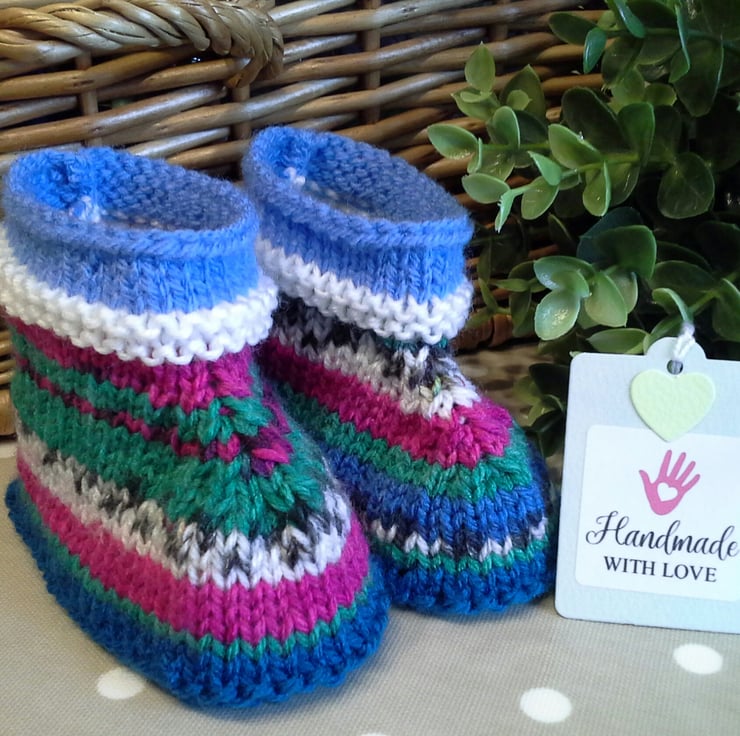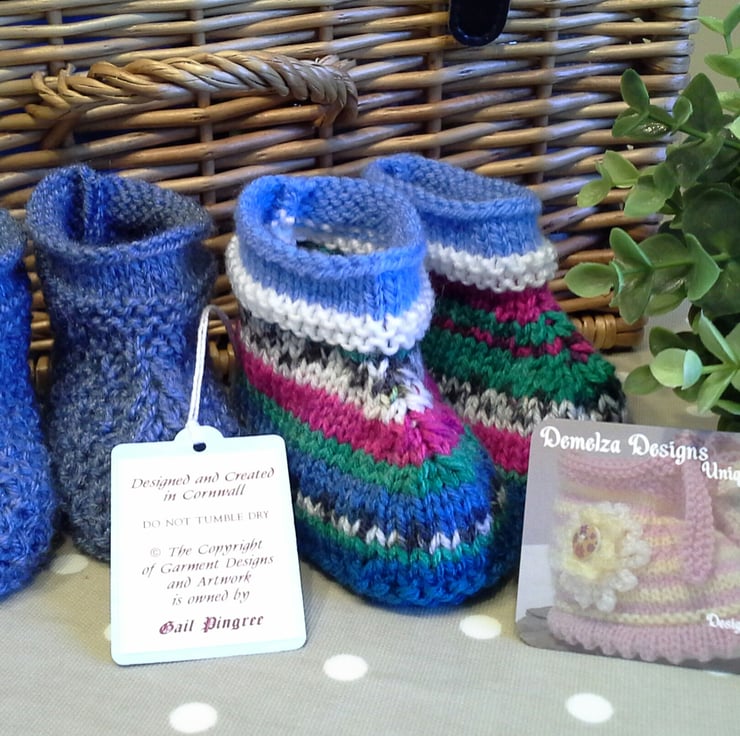 A sweet practical two pair pack of booties lovingly designed and totally hand crafted. The yarns used are British premium acrylic and machine washable at low temperature settings.