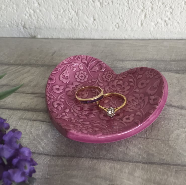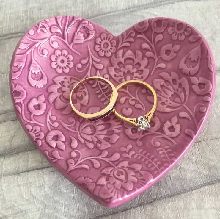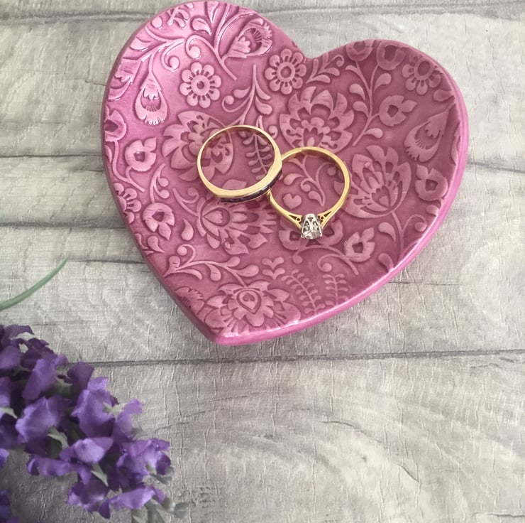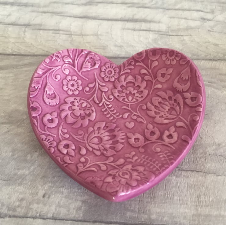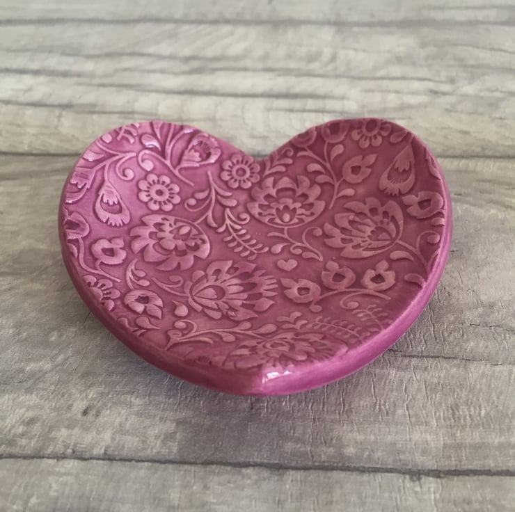 The dish has been individually made by rolling out clay and then rolling the flower pattern onto the clay. Next I cut the heart shape out using a cutter and shaped it into a dish form. Once dried the clay was then fired in my kiln. Once fired to bisque ware, I painted the colour on it in underglazes, then clear glazed it and gave it it’s final firing.