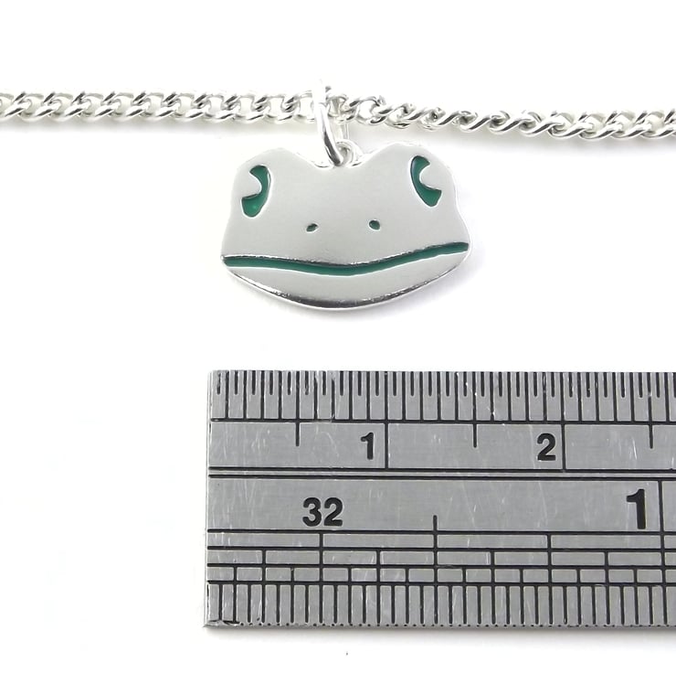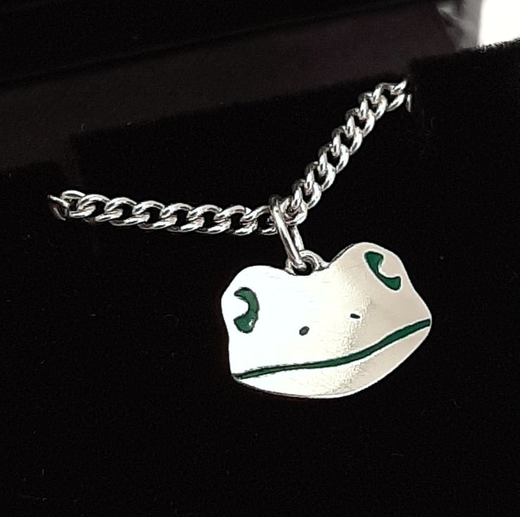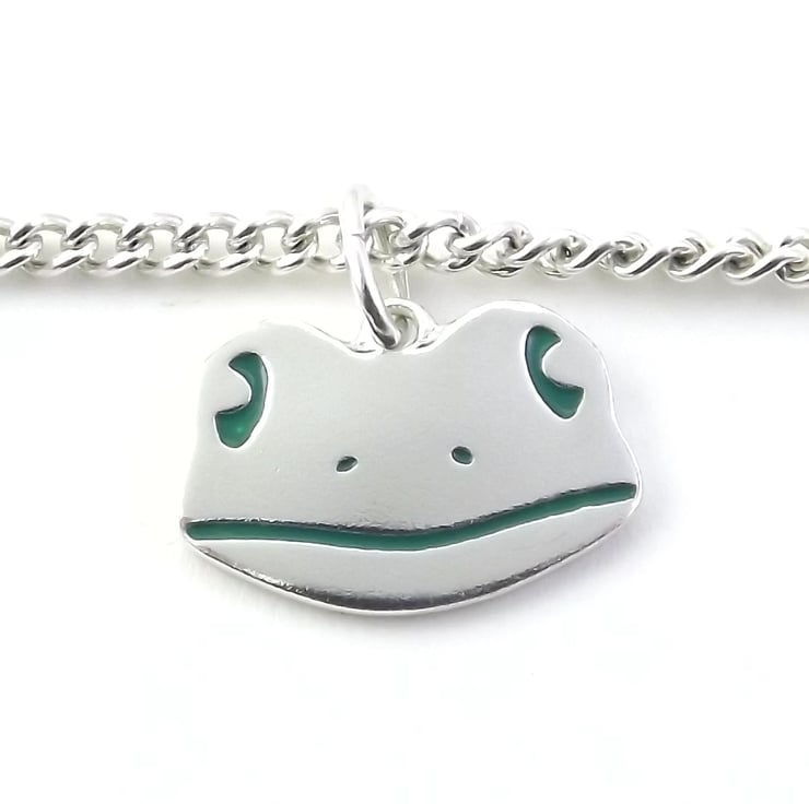 This silver frog bracelet is from my wildlife themed jewellery range and have been lovingly handmade in Shropshire. It is made from sterling silver sheet and is etched before being cut by hand, the edges are then smoothed using files and emery paper before it's carefully given there shape using a punch and hammer. A 5mm oval jump ring is then attached. A green resin based enamel is added to the etched areas and then the frog charm is polished before being attached to a chain.