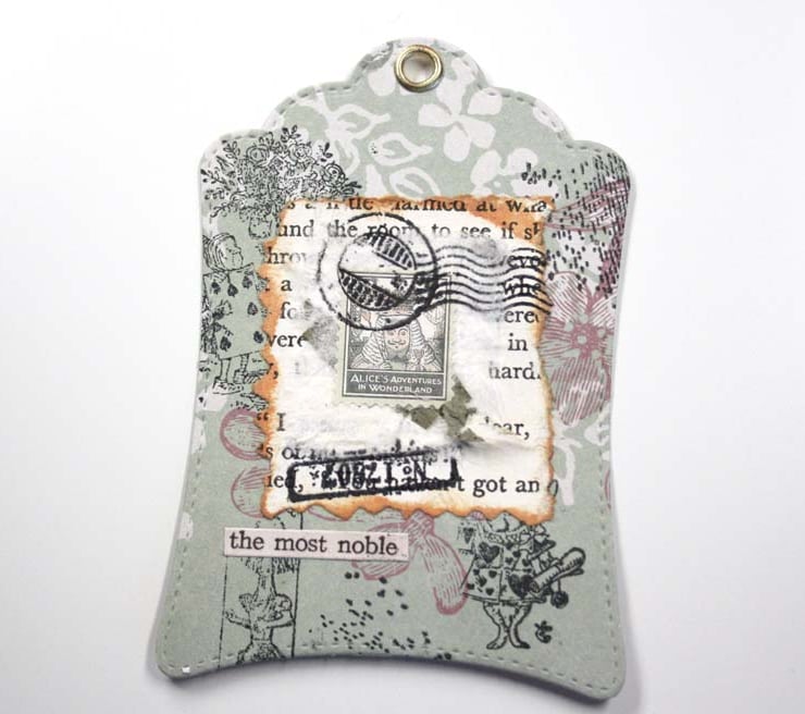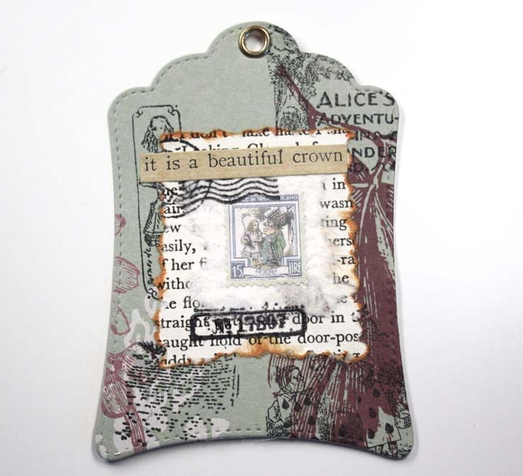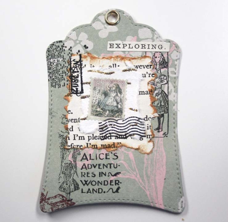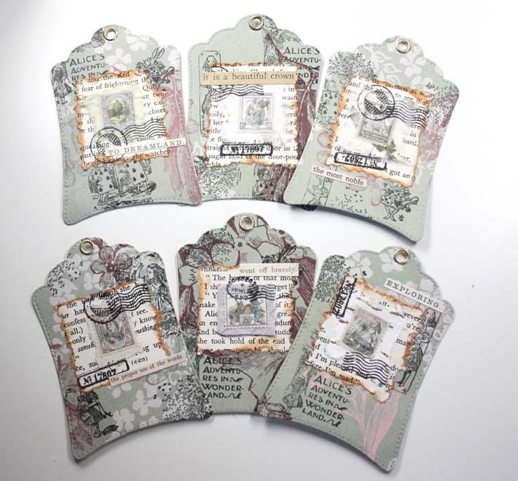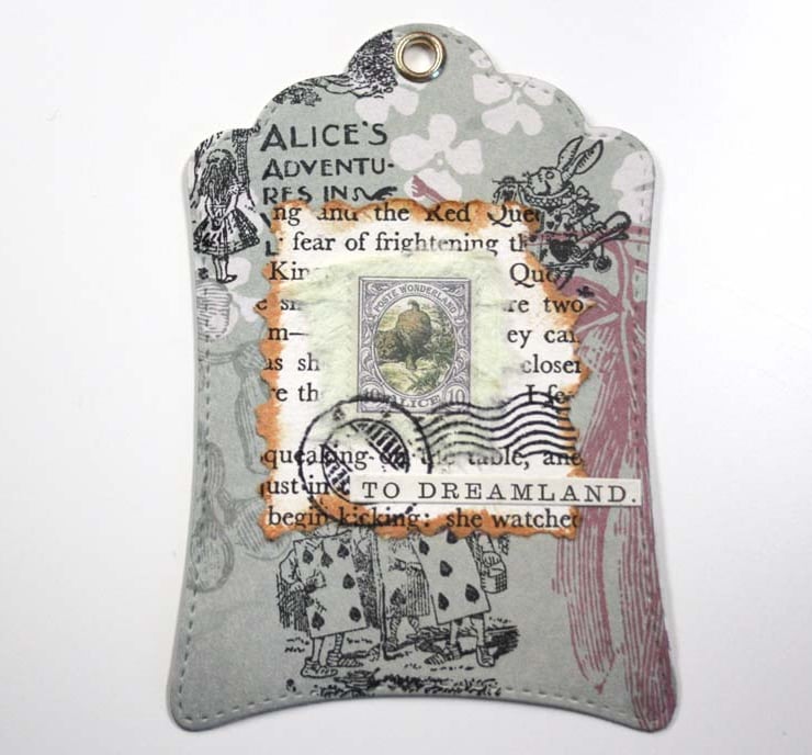This collection of 6 tags feature classic Alice in Wonderland images. Scrapbook paper has been hand stamped with Alice inspired rubber stamps, and faux Alice in Wonderland stamp stickers have been layered atop vintage Alice in Wonderland book page and handmade paper. Each tag has been finished with a Tim Holtz phrase sticker. This set comes complete with a large tag pocket.