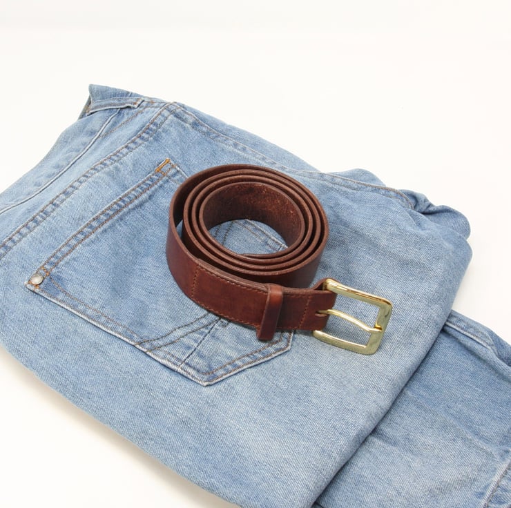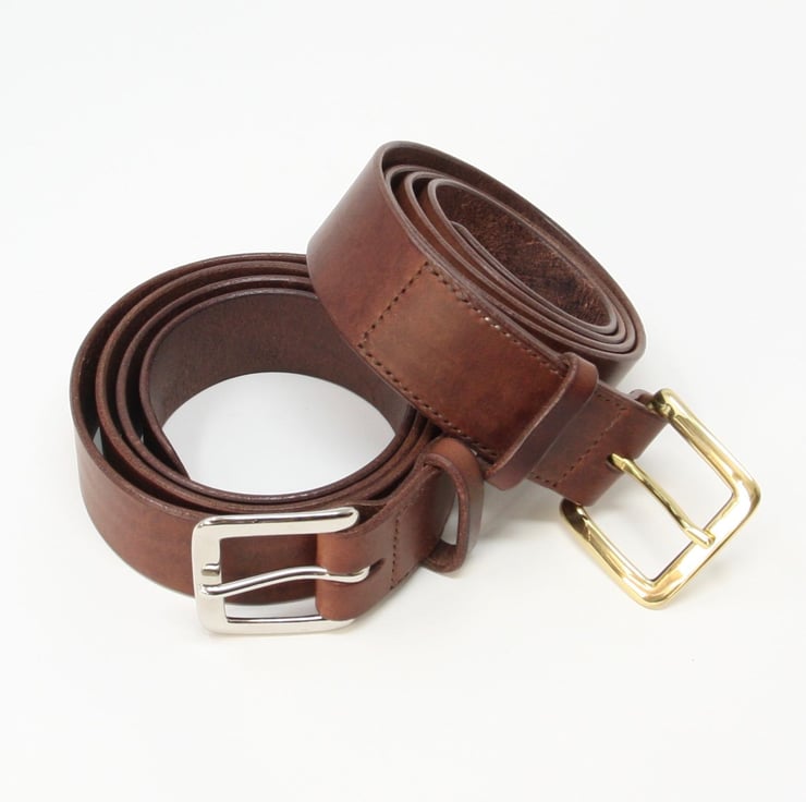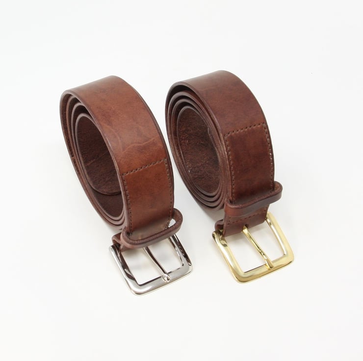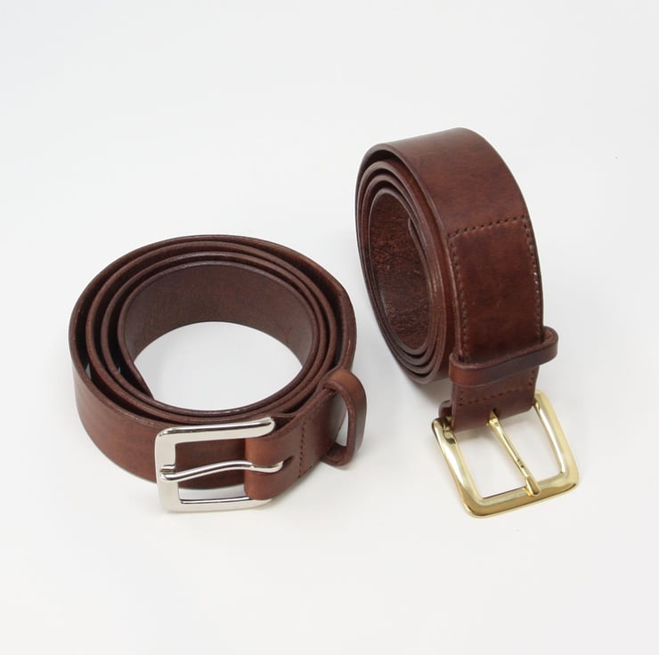 1.5" (38mm) wide Italian brown leather belt with choice of silver or brass buckle and leather keeper.