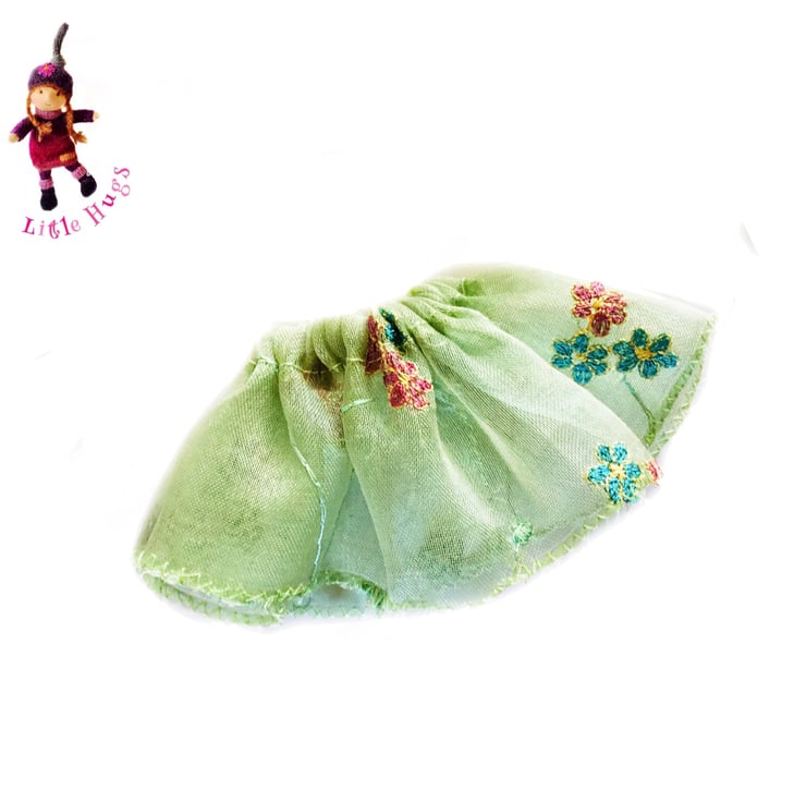 A sweet little pale green organza skirt, embroidered with pretty flowers to fit the little Hugs. The skirt has an elasticated waist.
