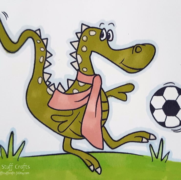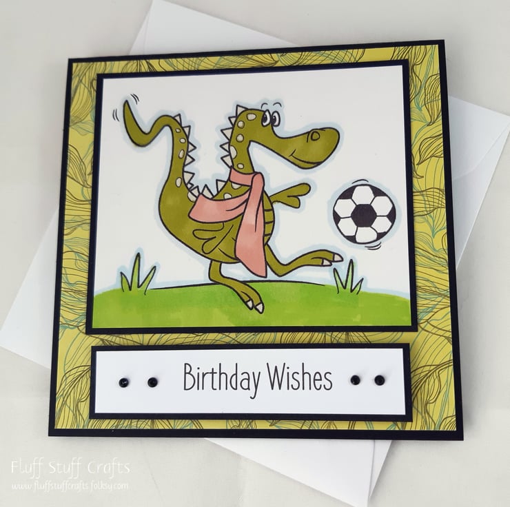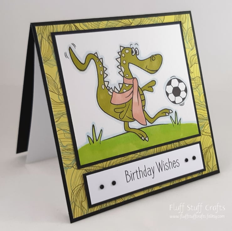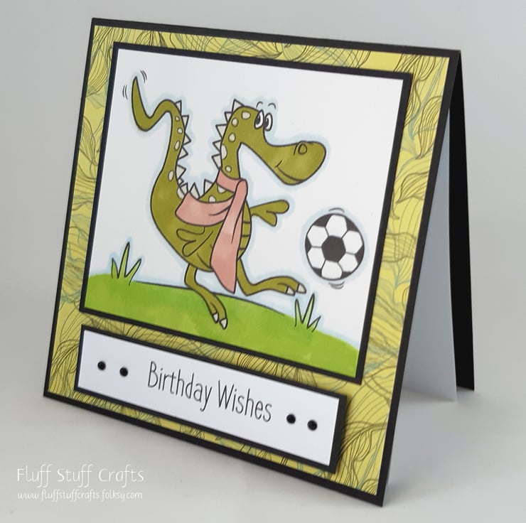 Square birthday card featuring a hand coloured image of a dinosaur or dragon playing football. The image has been framed in black card, along with the sentiment 'Birthday Wishes' and overlaid onto a lime green patterned paper, on a black card base. The sentiment has been embellished with two black gems either side of the wording.