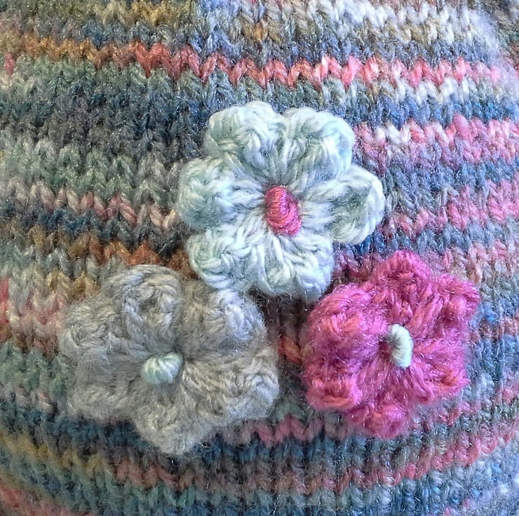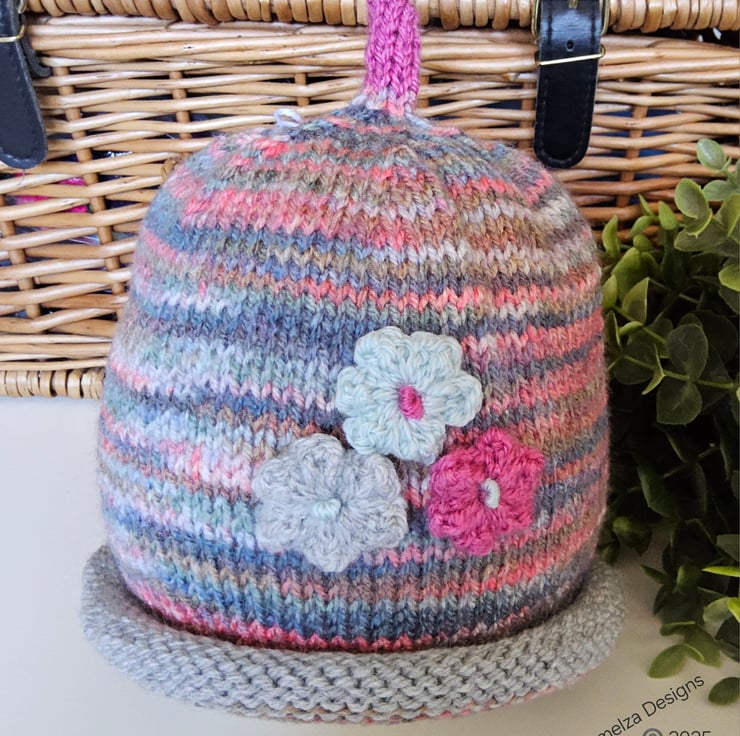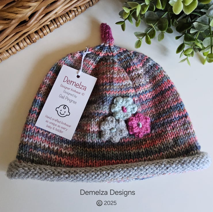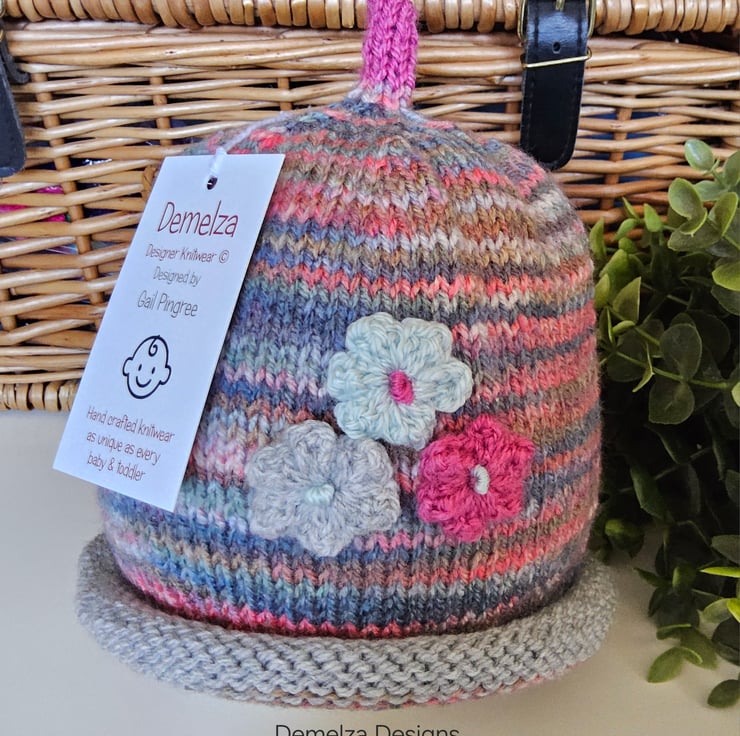 A sweet practical hat for a toddler lovingly designed and totally hand crafted in Cornwall. It has been made from British manufactured quality premium acrylic yarns which are machine washable at low temperature settings. The flowers have been hand crotcheted with french embroidery knots in the centre. The rim can be rolled up or down to the required depth of child's head. On the back side seam the soft damask Demelza Designs garment label has the care instructions woven within it. A branded garment swing tag is attached to the front providing a professional finish if gifting.