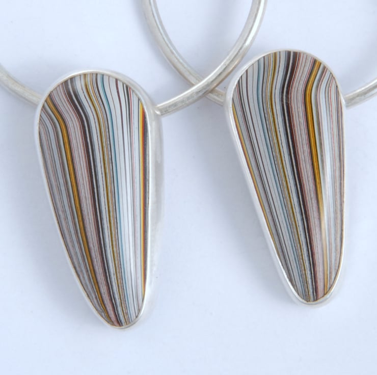 Fordite is the name given to the build up of paint in the spray booths at car factories. The paint gets cured in between each layer so it becomes rock hard allowing it to be cut and polished for use in jewellery. I cut and polish this material myself and you can see the rough in one of the photos (not included) and from the colours I have uncovered during cutting this I have dated the material to a Dodge factory in 1970 (so perfect if you love old muscle cars). Love fordite but want something else? Drop me a message I have a bit of this rough left so should be able to make you something extra special.