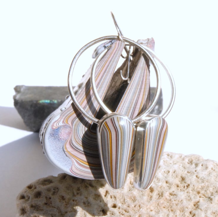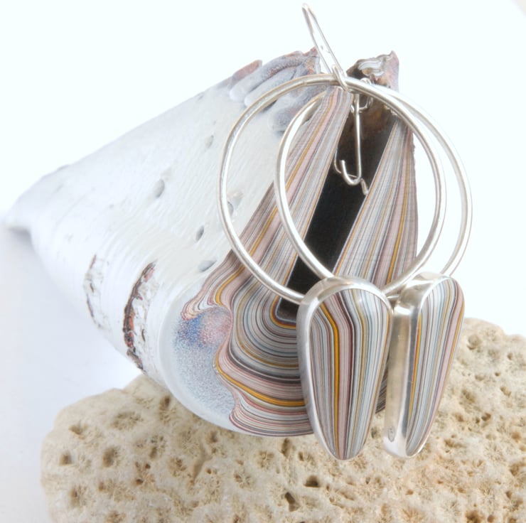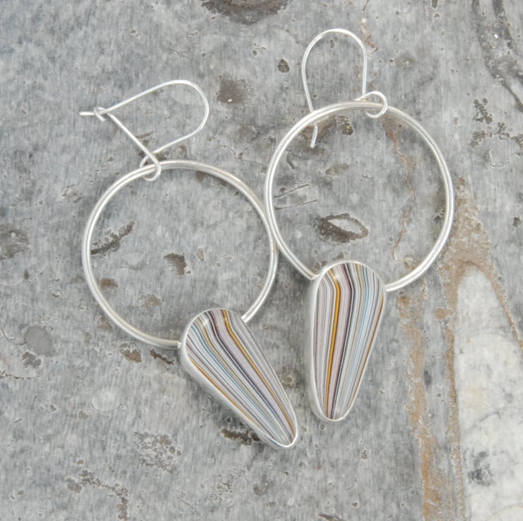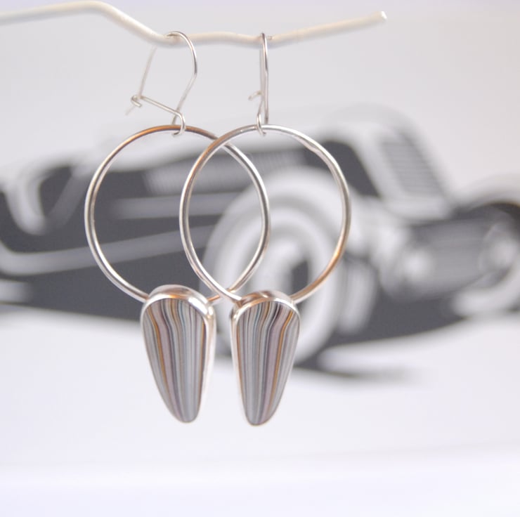 These statement earrings feature drops of vintage fordite hanging from rings of sterling silver, they are not a true hoop earring as the hoop hangs from a safety hooks (also known as kidney wires). The fordite are a well matched pair with a finely striped pattern on a white ground, the most obvious of the stripes is yellow but there is also blue and red in there. The fordite moves freely on the hoop and the hoop moves freely in the hook so these earrings have lots of movement as well as an eye catching size (65mm drop, 32mm across).