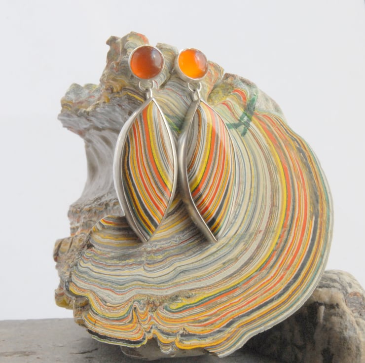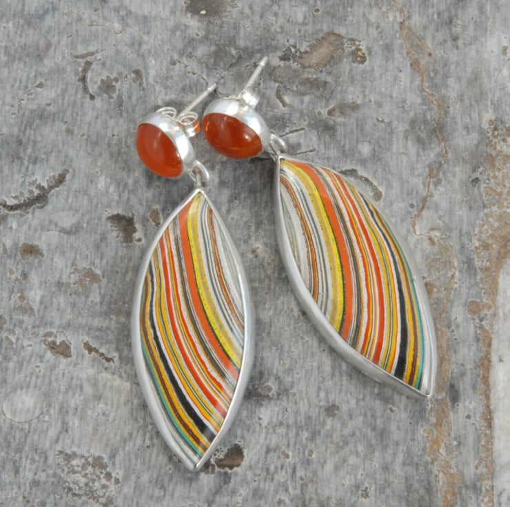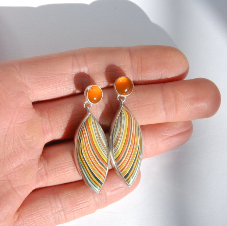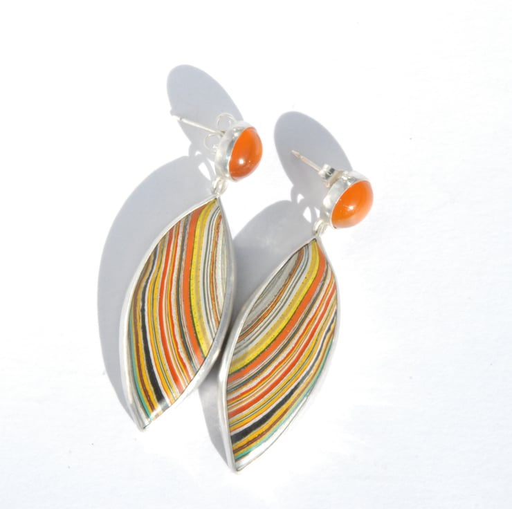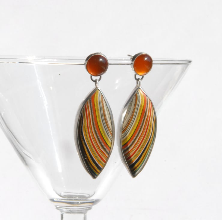 These retro earrings feature marquise shaped drops of colourful fordite combined with zesty orange carnelian, there is a post and scroll fitting behind the carnelian. The fordite features curving lines in vibrant orange and yellow sweeping across the drops. The fordite used in these eye catching earrings came from Ford's Dagenham plant in the 70's so these would be a great gift for any one who loves a bit of retro or has an association with Dagenham.