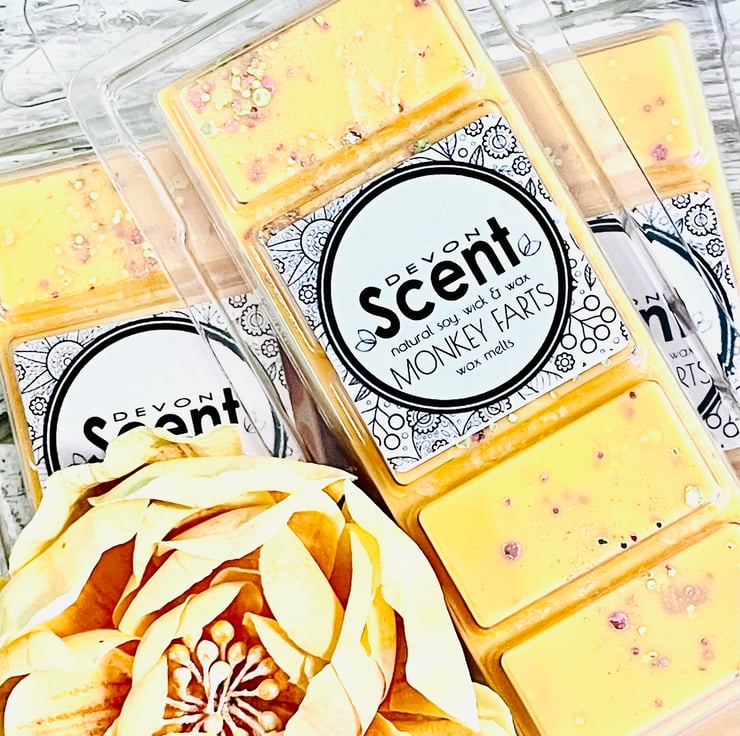 Our highly fragranced Monkey Farts Snap Bar Soy Wax Melts have a blend of tropical banana with a hint of coconut and grapefruit.