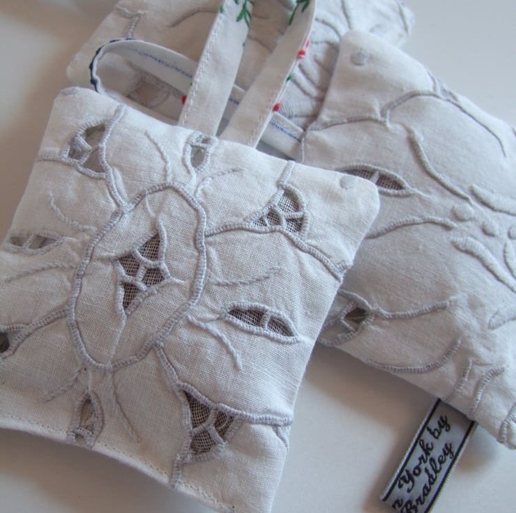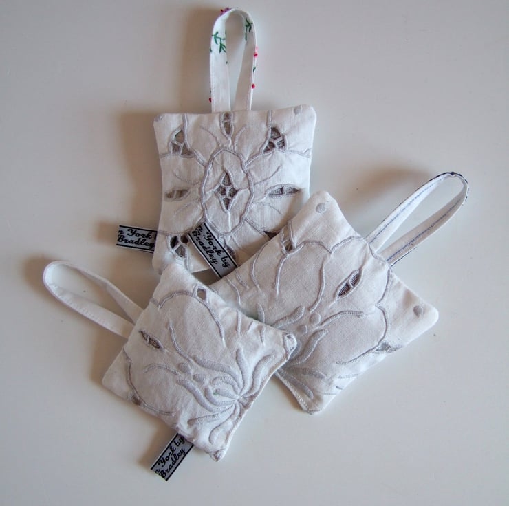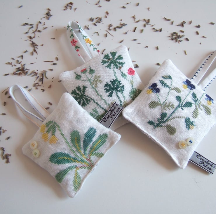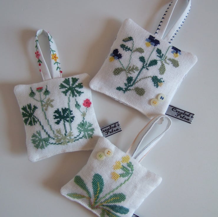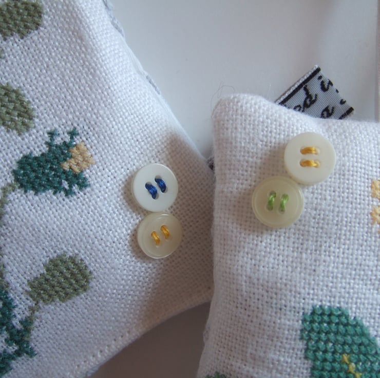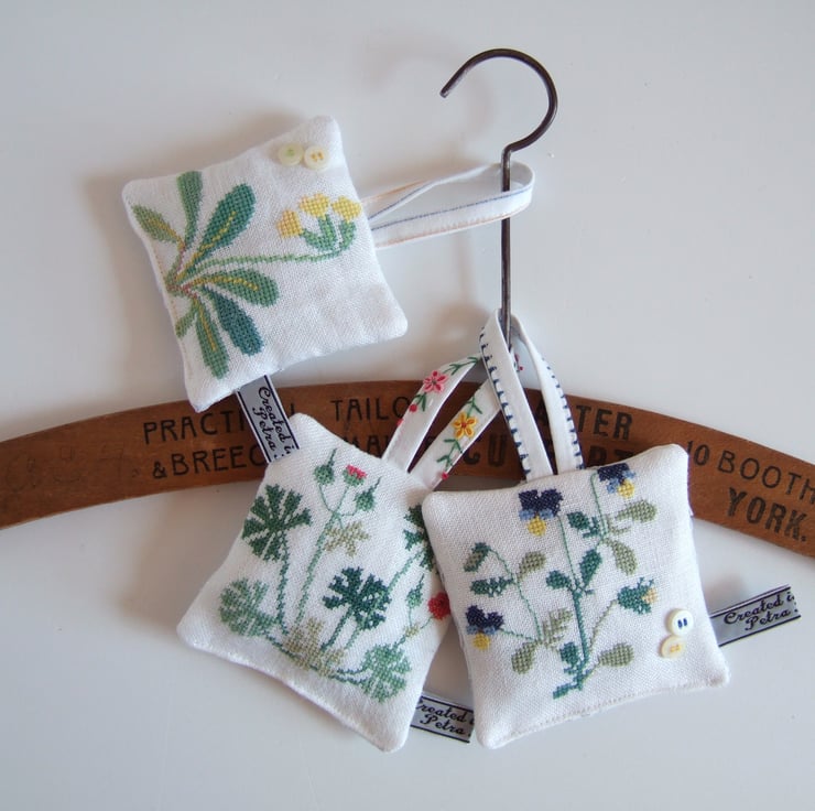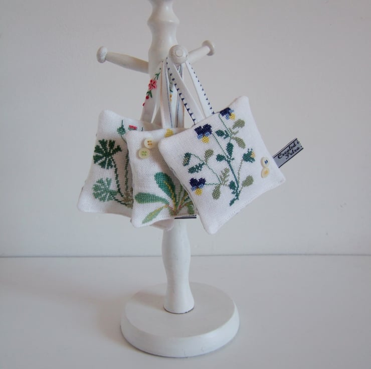 The cowslip and pansy are decorated with a pair of vintage buttons, and they are all backed with a cotton tray cloth with cut back embroidery to let out the scent. They are finished off with my own embroidered name tag.