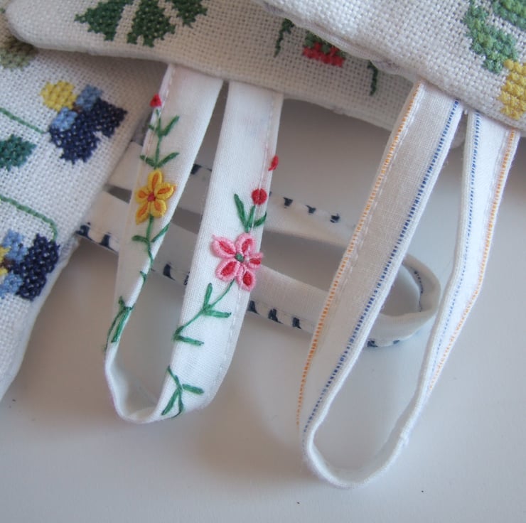 Hi there and welcome to my shop. Here you will find old embroideries, vintage fabrics and sparkling remnants made into something pretty and practical once again. I re-stock slowly but surely, so do keep coming back for a browse.