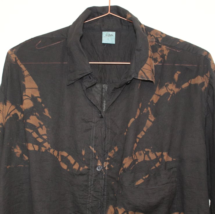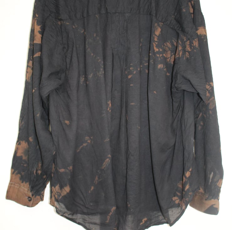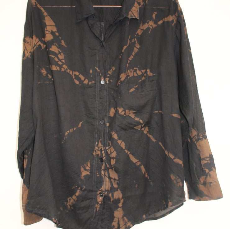 The colours of the blouse are black and copper tie dye, on an opaque chiffon style 100% viscose fabric, the closure is button up.