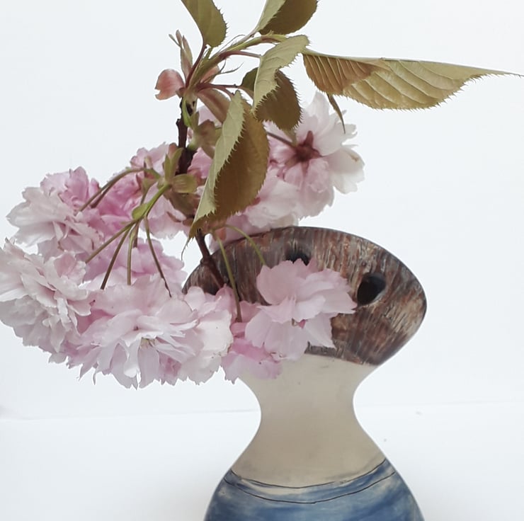 Hand built figurative vase measures approximately 23cms. Painted with coloured slips and glaze in a transparent glaze .Ceramic decals of birds, bugs and flowers are fired on to add detail. Openings at the back of her head allow for dried flowers or grasses. Will be carefully packed and posted.