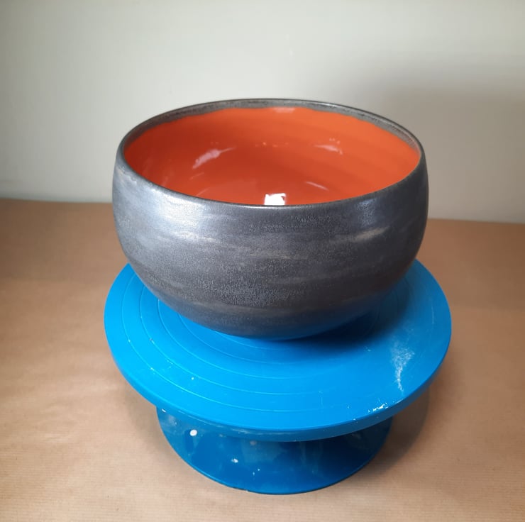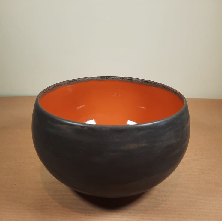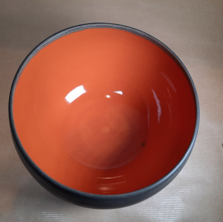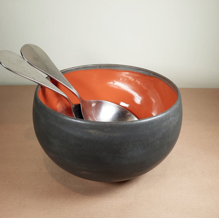 Large ceramic bowl with a round shape. A glossy burnt orange glaze has been used on the inside and a dark Charcoal on the outside.