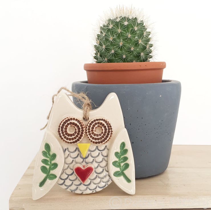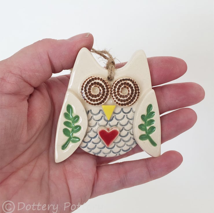 This cute little owl is made from white earthenware clay. Each part has been embossed with pattern and then cut from hand made templates. Finished with a brown string. It measures 7cm high by 6cm wide by 1.5cm deep. Glazed on the front, plain cream clay colour on the back.