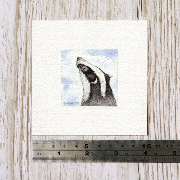 This listing is for one original miniature watercolour painting of a badger looking skyward. The image is 2 inches square (5x5cm) painted on a 4x4 inch (10x10cm) piece of quality cotton rag watercolour paper with artist quality paints. Signed but unmounted and unframed. Paintings are well packaged in protective folders to keep your purchase clean. This is not a printed reproduction.