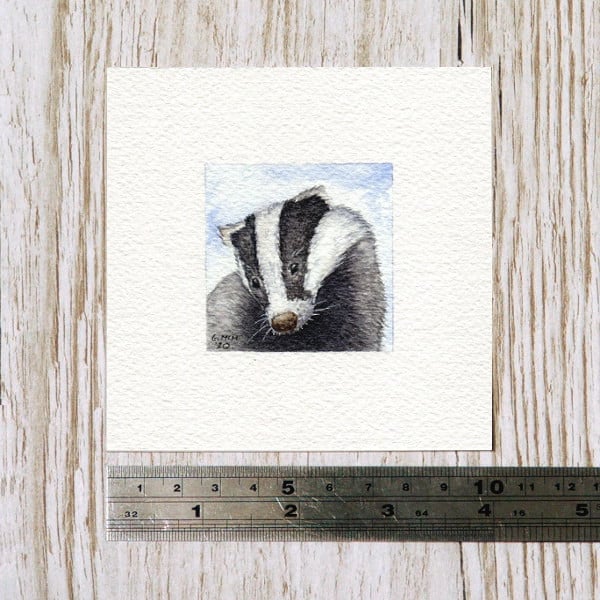 This listing is for one original miniature watercolour painting of a little badger looking downward, contemplating the wonders of his world.