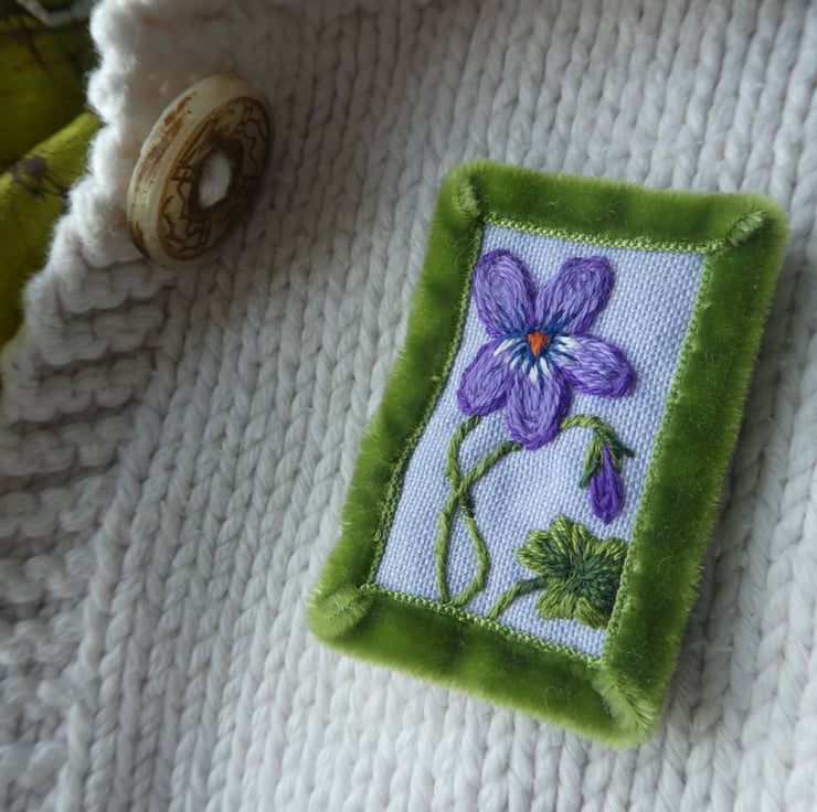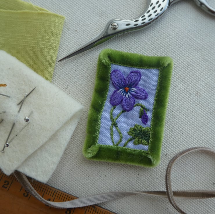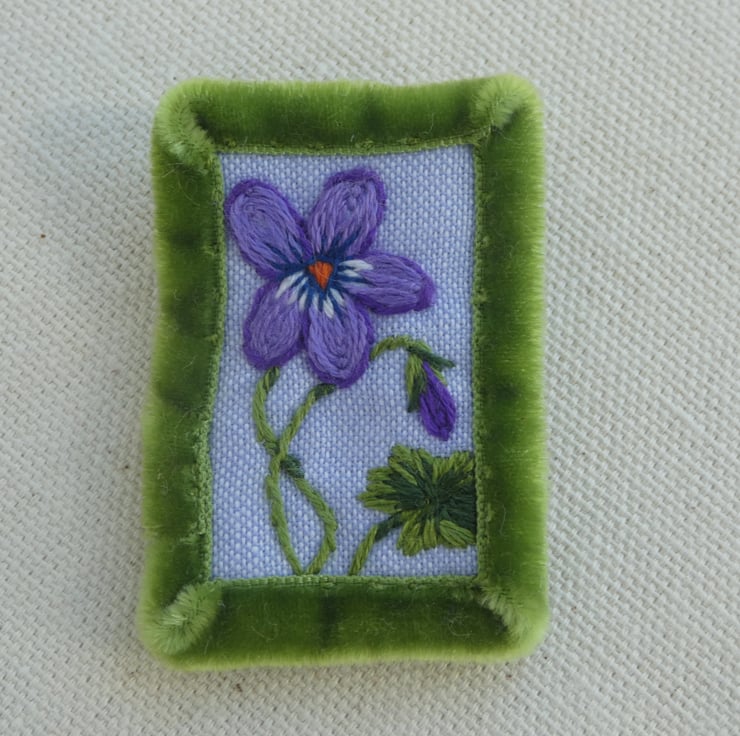 This little brooch shows one of the first wildflowers of Spring - a sweet violet. It was hand embroidered onto a soft cotton background in a lilac colour, and then edged with a soft green velvet ribbon giving it structure and a touch of luxury.