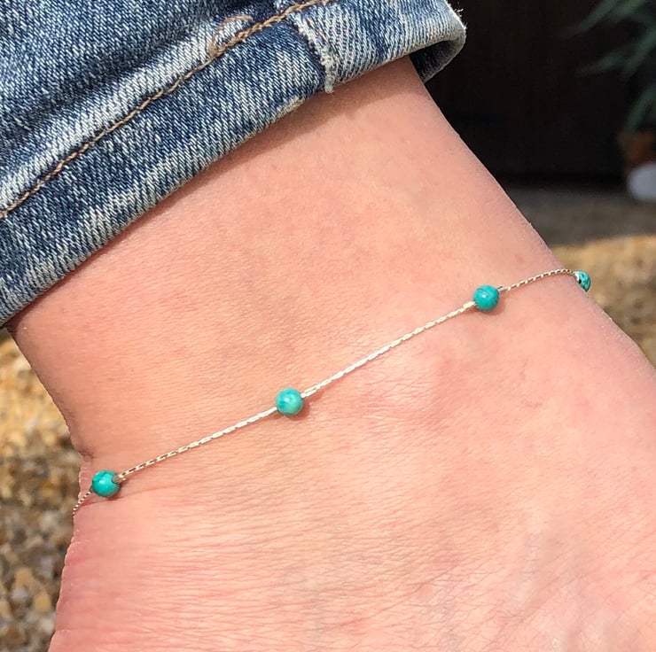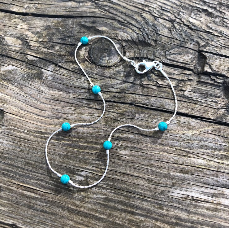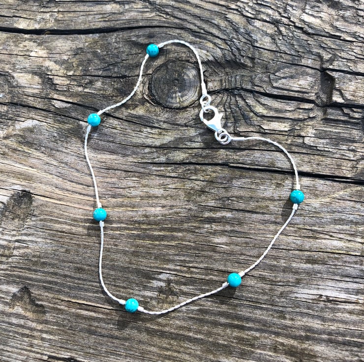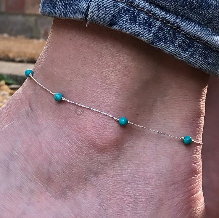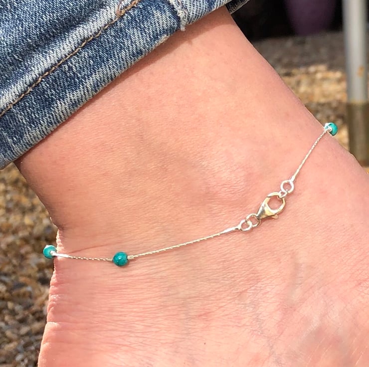 This anklet has been made using sterling silver beading chain. To this I have added Semi precious turquoise beads. The beads are secured into position using sterling silver crimp beads.
