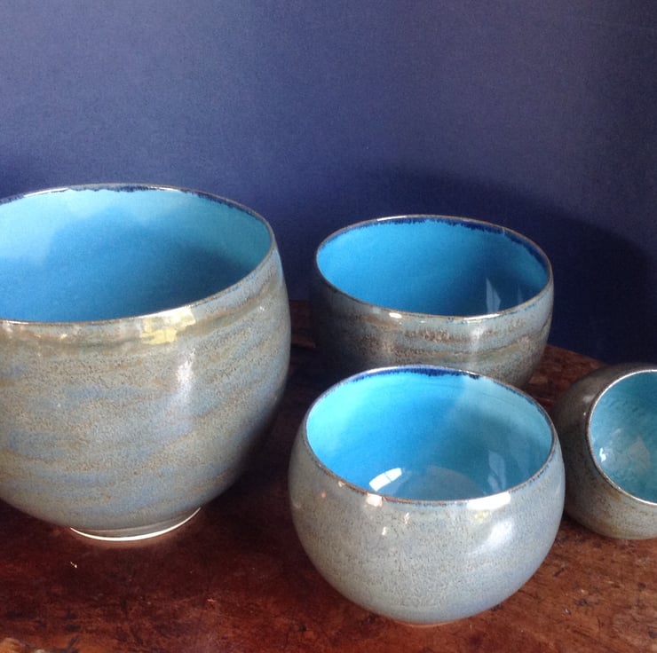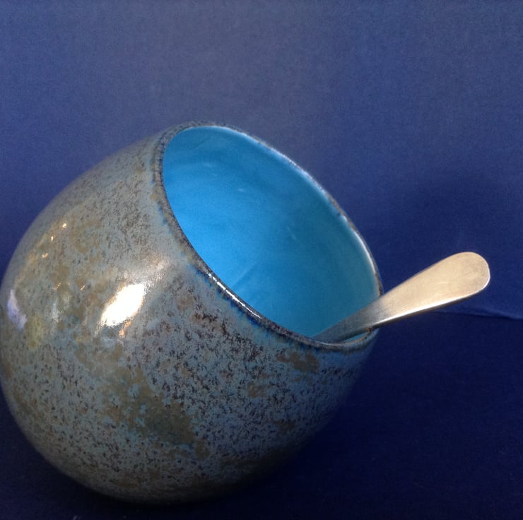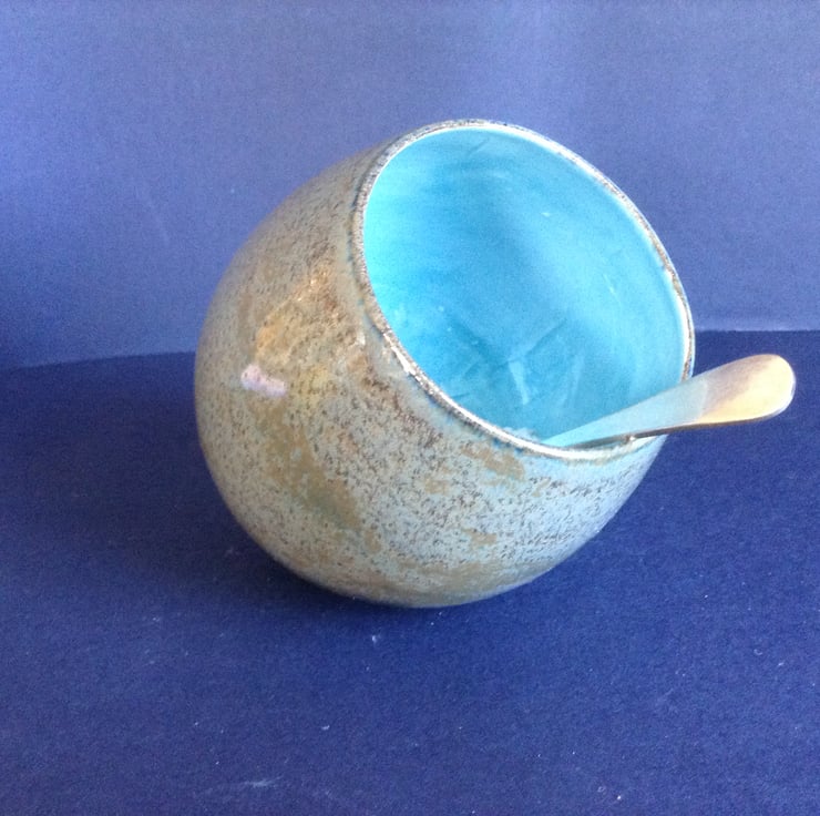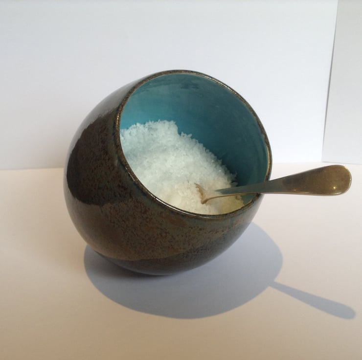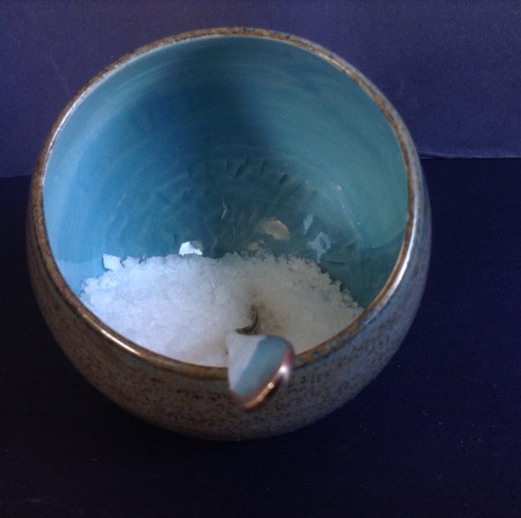 The salt piglet has a glossy turquoise glaze on the inside (a good contrast to white salt crystals) and a turquoise/brown mottled glossy glaze on the outside.