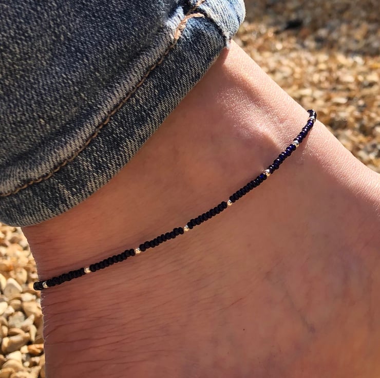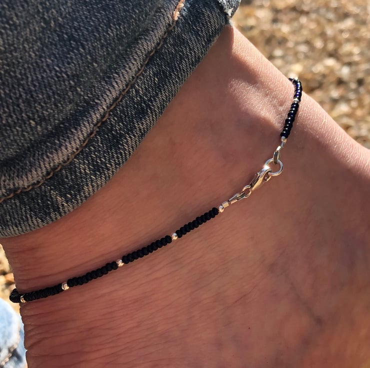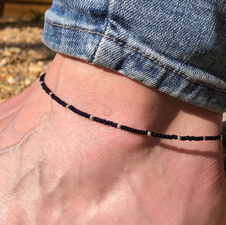 Hand beaded anklet. Made using tiny Czech glass seed beads and 2mm sterling silver beads. Hand beaded into strong tiger tail wire, secured with crimp beads and wire guards. Fastened by a sterling silver lobster clasp.