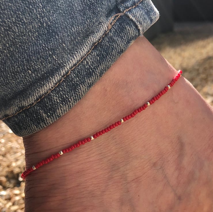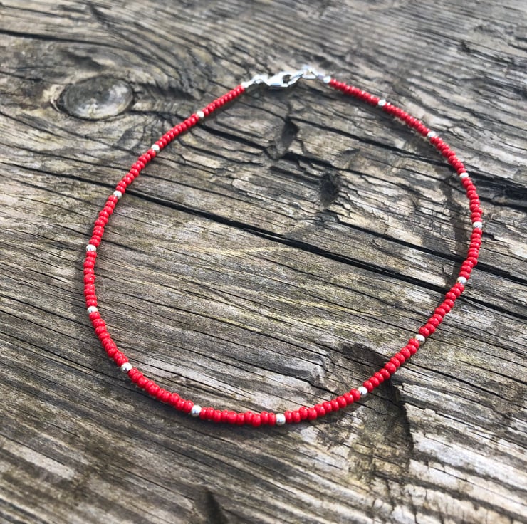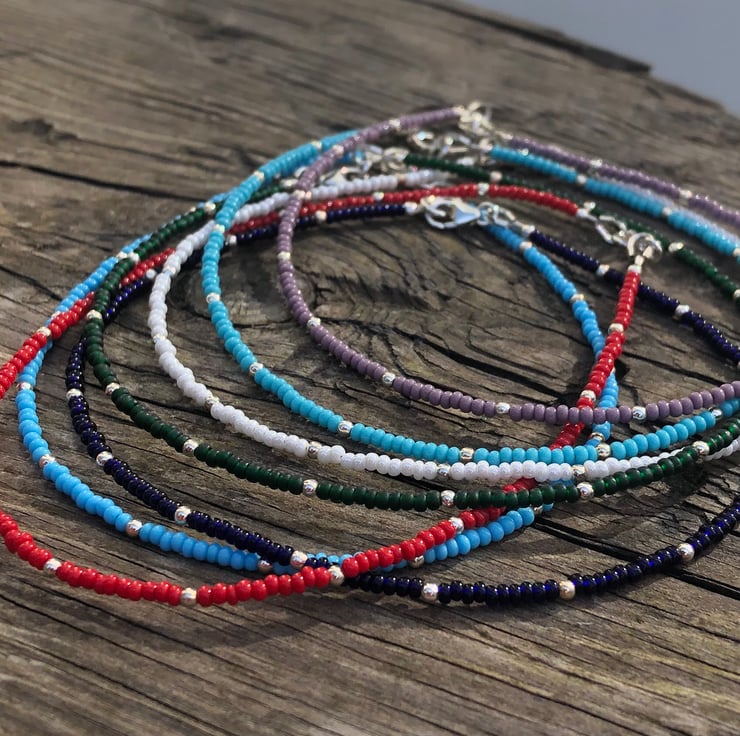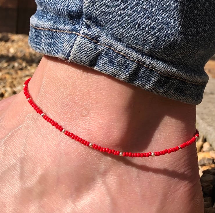 Hand beaded anklet. Made using tiny Czech glass seed beads and 2mm sterling silver beads. Hand beaded into strong tiger tail wire, secured with crimp beads and wire guards. Fastened by a sterling silver lobster clasp.