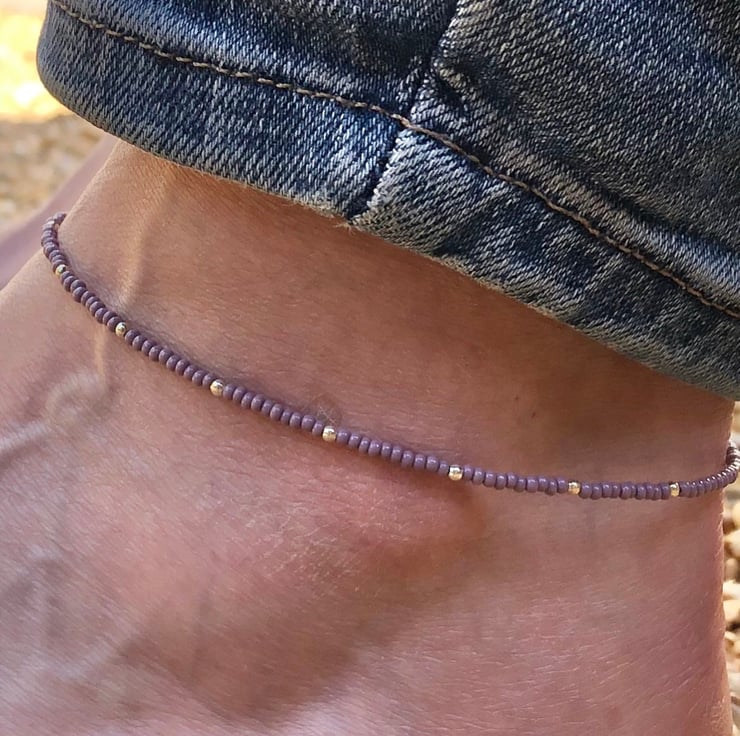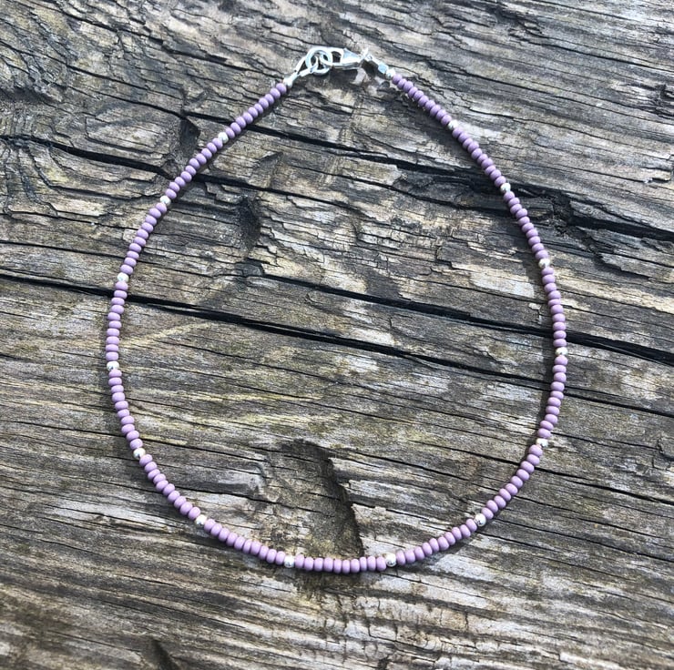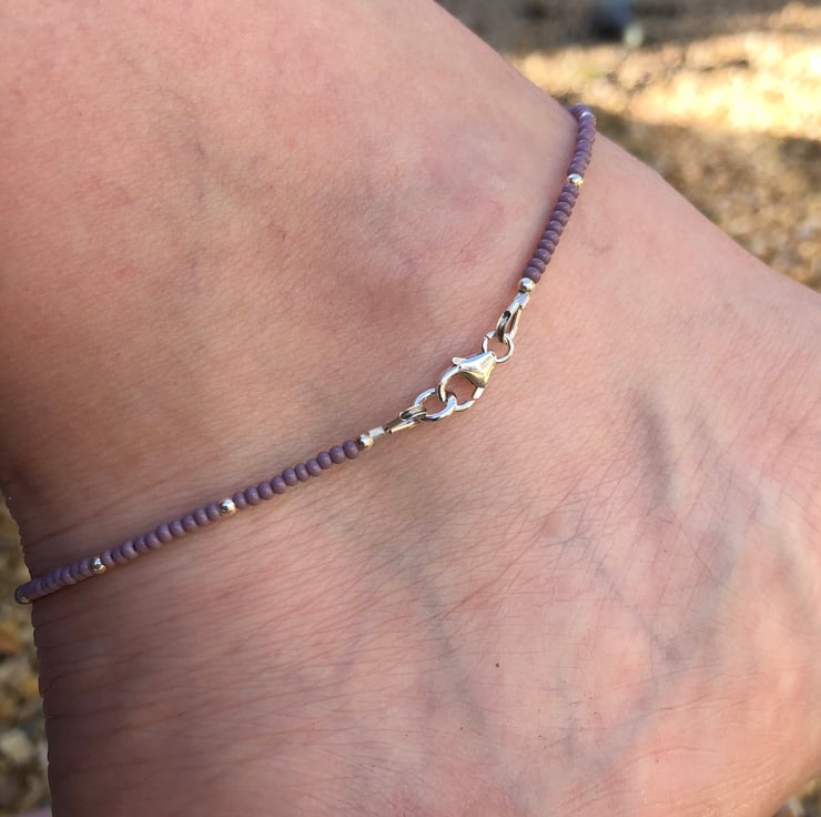 Hand beaded anklet. Made using tiny Czech glass seed beads and 2mm sterling silver beads. Hand beaded into strong tiger tail wire, secured with crimp beads and wire guards. Fastened by a sterling silver lobster clasp.