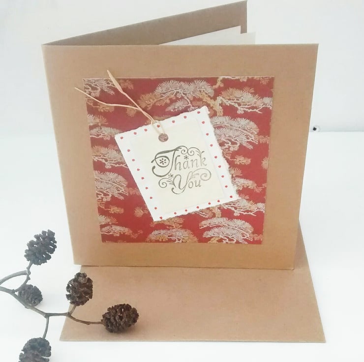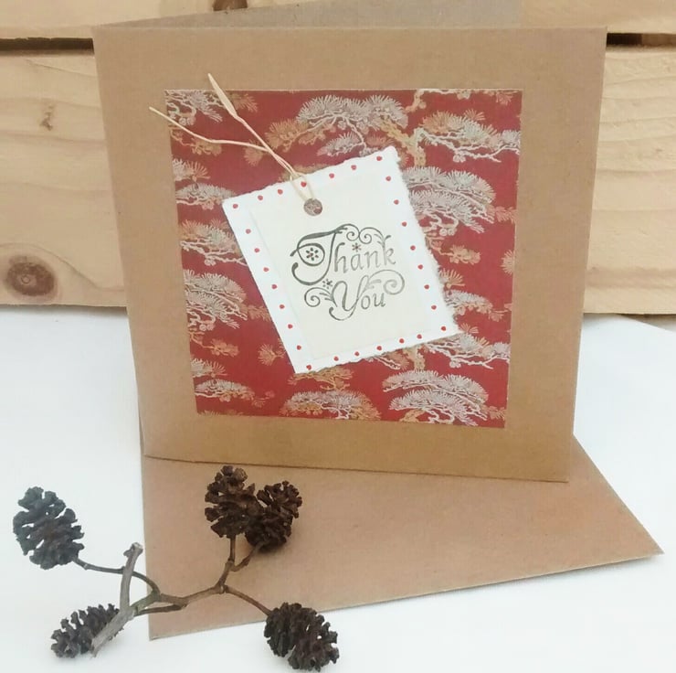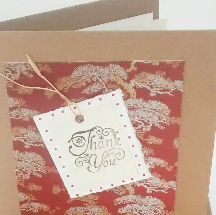 A one of a kind handmade card on recycled card stock. The card is individually hand stamped onto repurposed card and papers. The backing wallpaper features an oriental willow design.