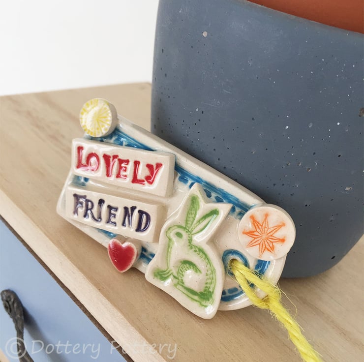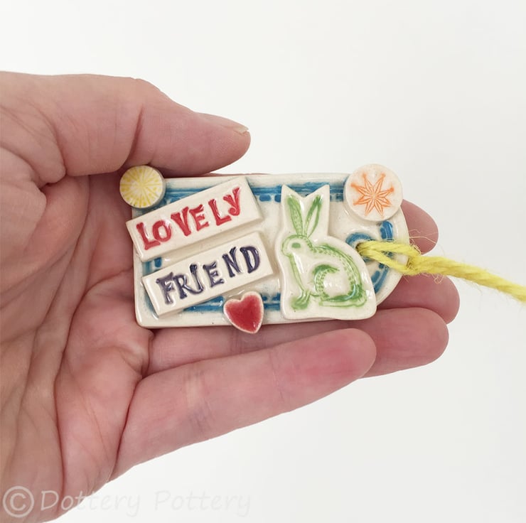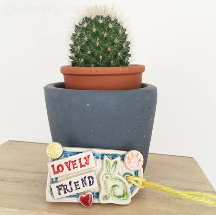 This cute little rabbit tag decoration is made from white earthenware clay and imprinted with the word Love. It would make a lovely gift tag for a special present or even just as a hanging decoration for someone you love. It has been fired twice and finished with a clear, glossy glaze for a lovely smooth finish. It measures 6.5 x 3.5cm and hang from a co-ordinating string.