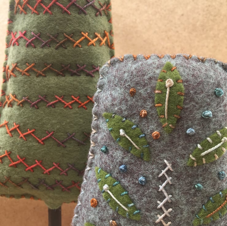 My own designs, so everyone is different and quirky. Hand embroidered with wonderful variegated pearle thread.