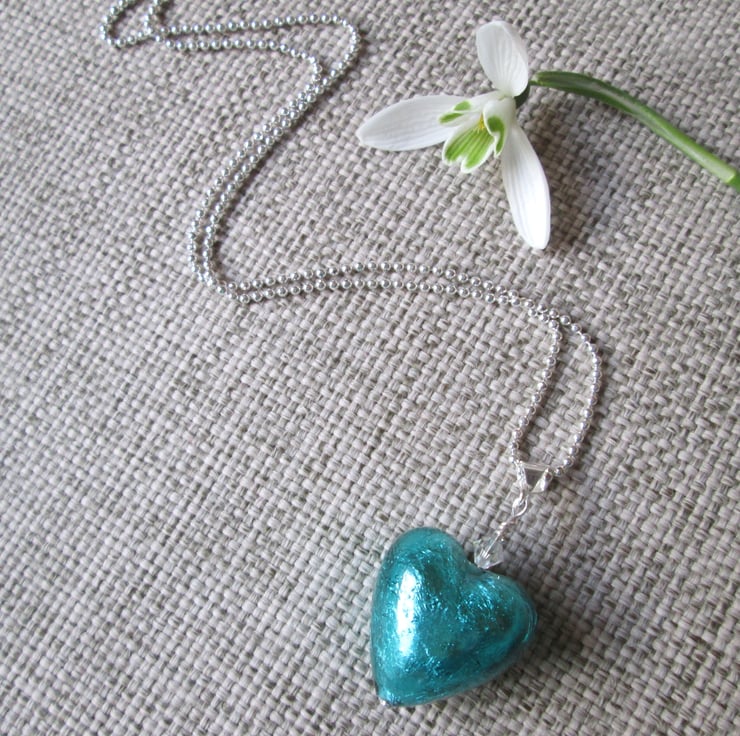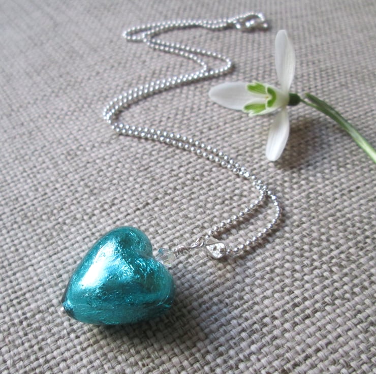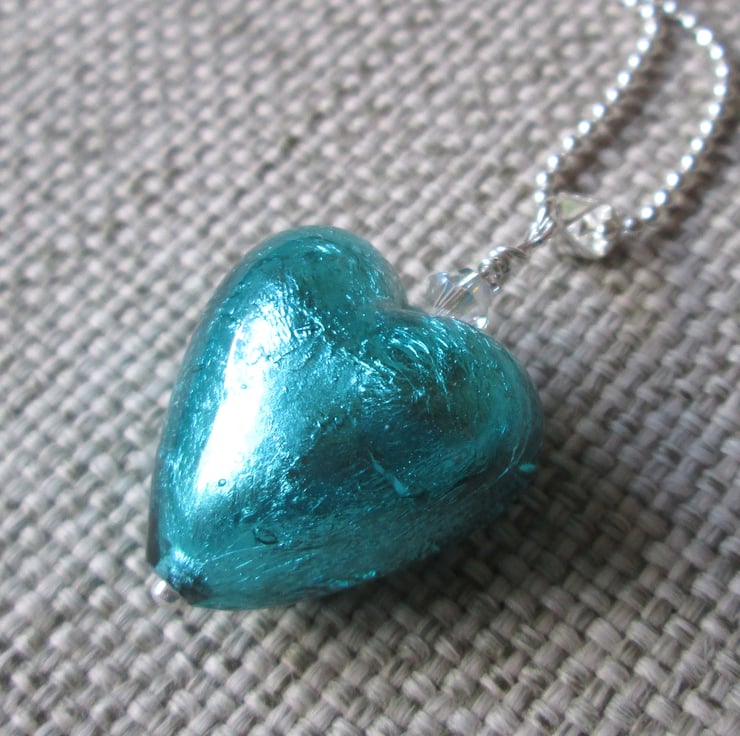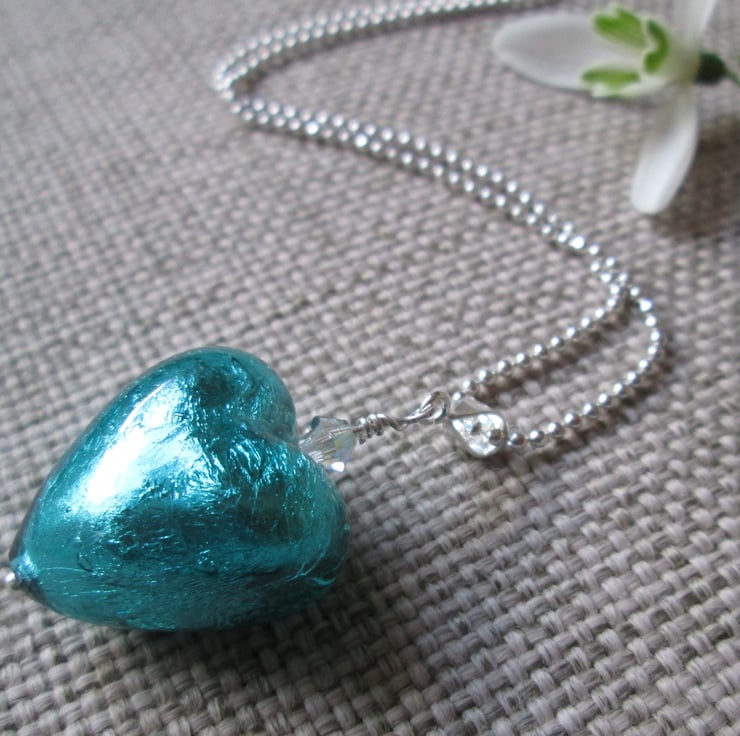 A beautiful Italian Murano glass heart in a bright aqua blue (approximately 2cm in diameter), with a sparkly Swarovski crystal on a sterling silver ball chain necklace (please choose if you would like a 16 or 18-inch chain). Murano glass is made on the Venetian island of Murano using traditional techniques. It is truly stunning and makes lovely eye-catching jewellery to finish off any outfit, day or night!
