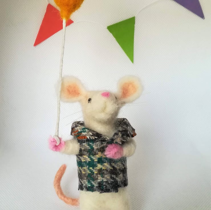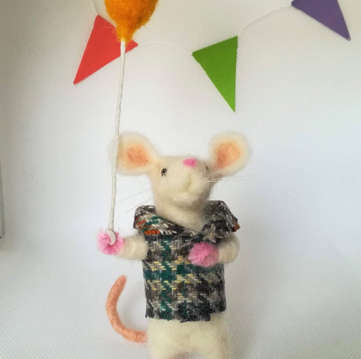 This charming little mouse is holding a yellow balloon and wearing a handmade tweed jerkin. He is hoping to make you smile!