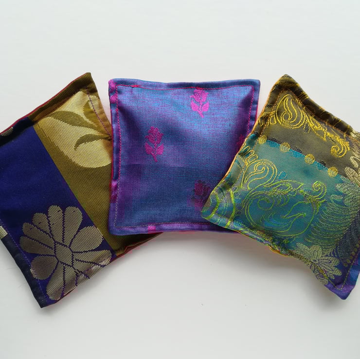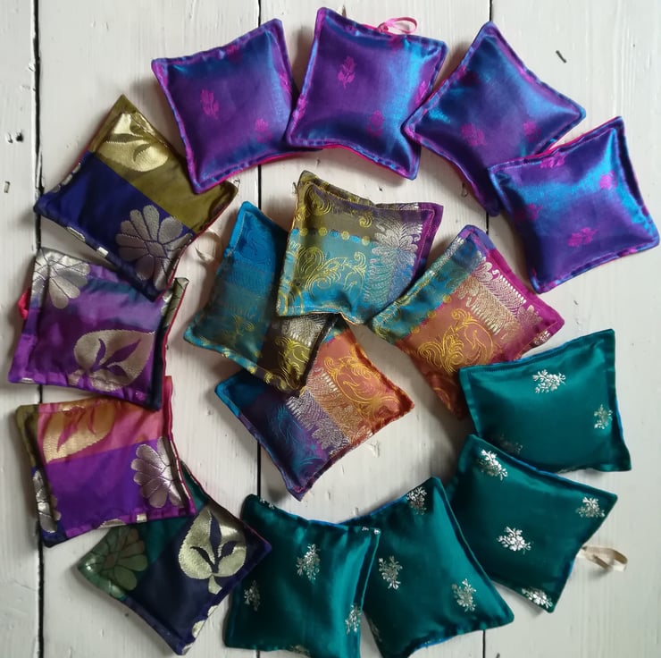 Jewel coloured lavender bags made from Sari Fabric. Go Bollywood!! These aromatic sachets will brighten your drawers and keep moths at bay with a little exotic glamour. Made from beautiful satin and gold embroidered sari fabric. They would make a great Secret Santa gift, Mother's Day gift or a glamorous addition to your bedroom or bathroom. They are two toned, with a complimentary coloured fabric on the back. You will receive 3 lavender bags which will be posted in a bag to preserve their scent.