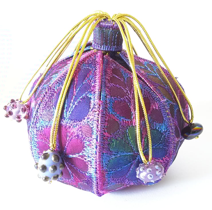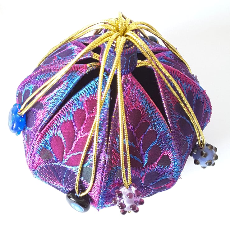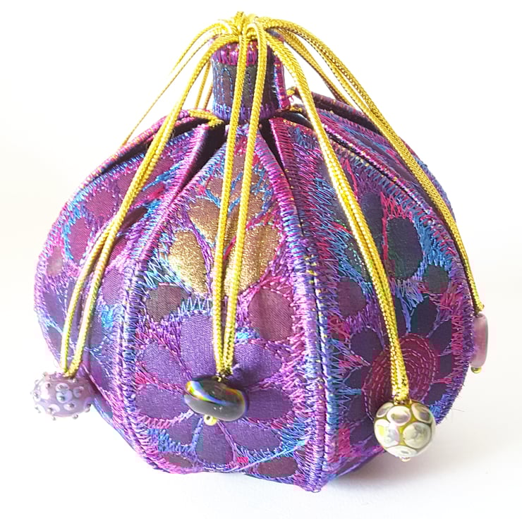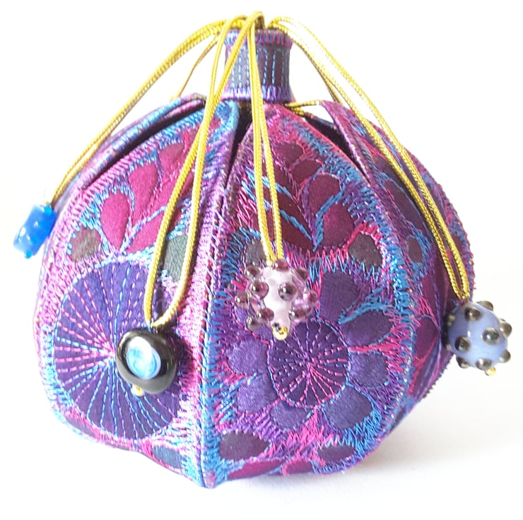 There is a coil of fabric to keep it closed and one of my own handmade glass beads hanging off the thread of each loop.